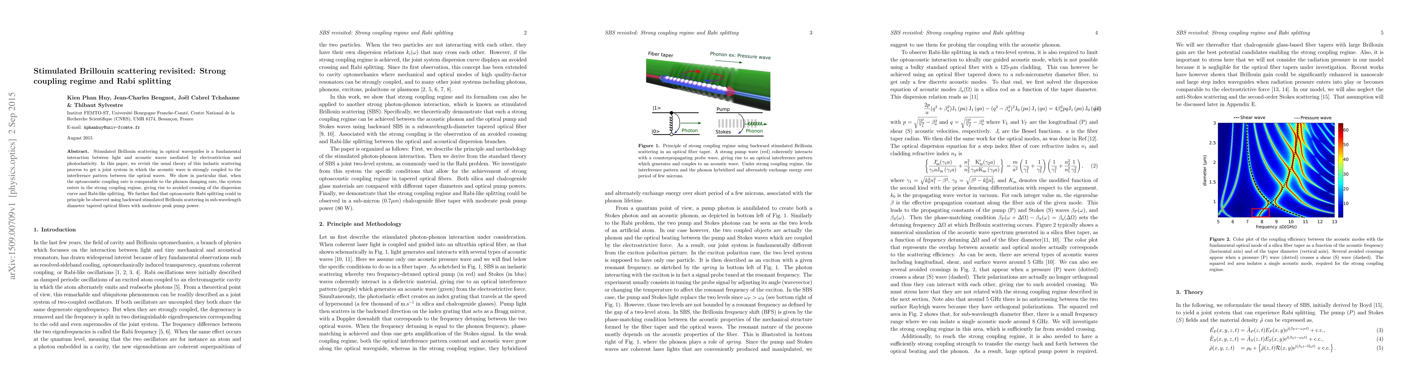 This paper revisits the theory of stimulated Brillouin scattering in optical waveguides, demonstrating strong coupling between the acoustic wave and the interference pattern of optical waves. It shows that Rabi splitting can occur in the strong coupling regime, potentially observable via backward stimulated Brillouin scattering in tapered optical fibers.