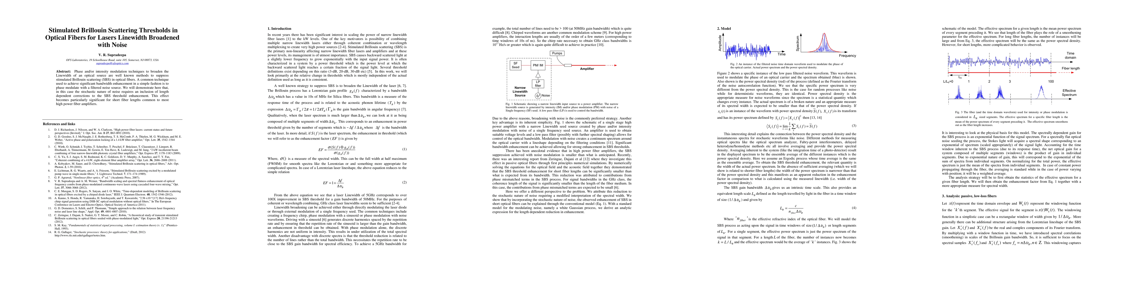 This paper investigates how phase modulation with a linewidth-broadened noise source suppresses stimulated Brillouin scattering (SBS) in optical fibers, highlighting the necessity of length-dependent corrections due to the stochastic nature of noise, especially in short fiber lengths typical of high-power fiber amplifiers.