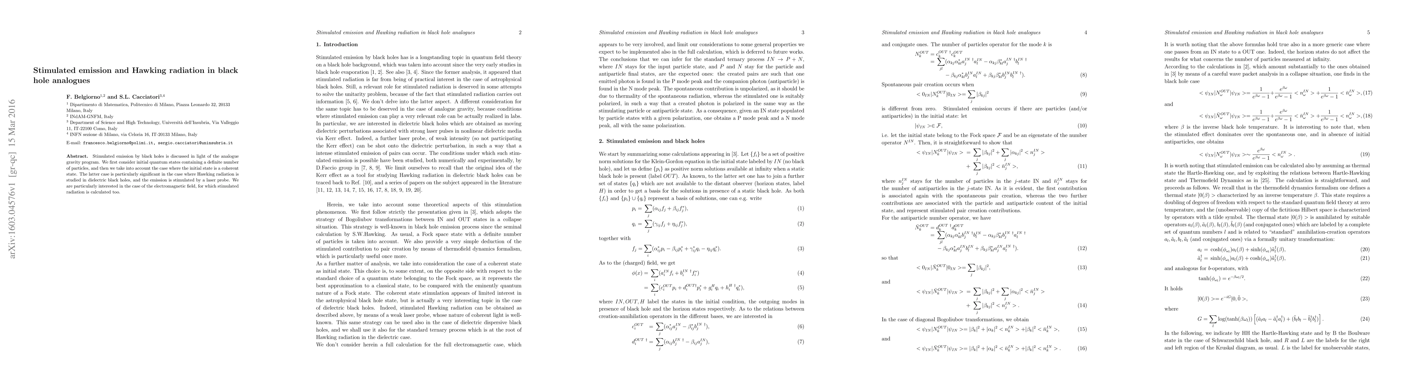 This paper explores stimulated emission and Hawking radiation in black hole analogues, focusing on initial quantum states, including coherent states, and their role in dielectric black holes. It also calculates stimulated radiation for the electromagnetic field.