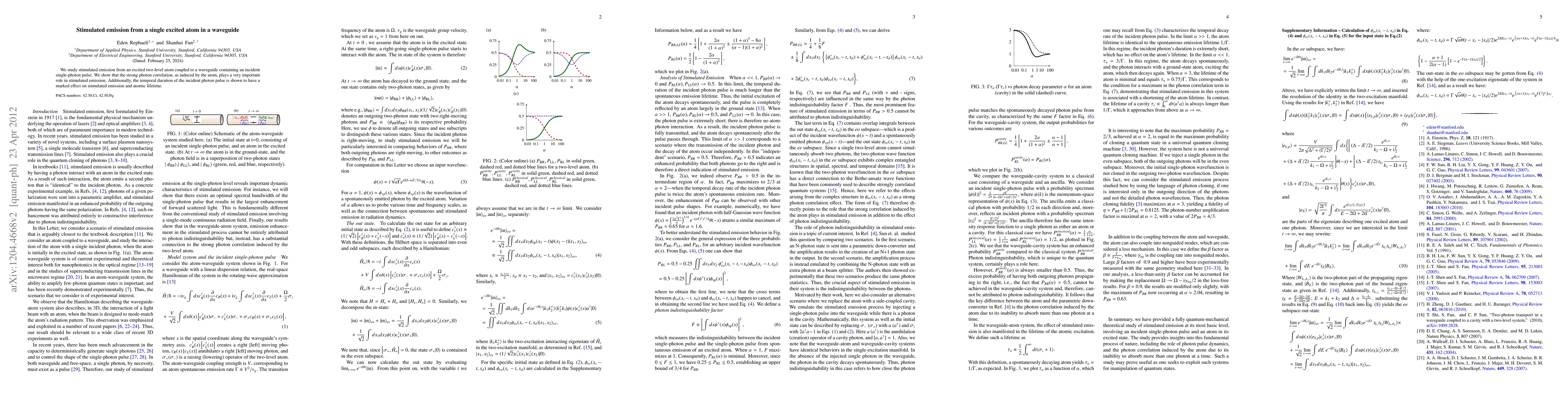 This paper investigates stimulated emission from a single excited atom in a waveguide, revealing that the atom's strong photon correlation significantly influences the emission process. The study also finds that the temporal duration of the incident photon pulse markedly affects both the stimulated emission and the atom's lifetime.