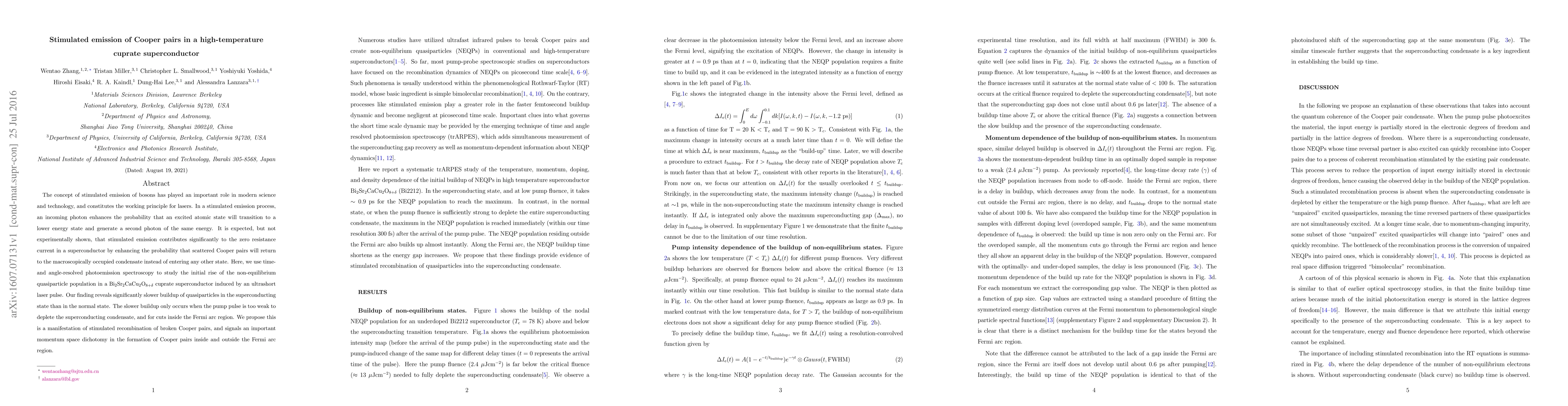 The concept of stimulated emission of bosons has played an important role in modern science and technology, and constitutes the working principle for lasers. In a stimulated emission process, an incoming photon enhances the probability that an excited atomic state will transition to a lower energy state and generate a second photon of the same energy. It is expected, but not experimentally shown, that stimulated emission contributes significantly to the zero resistance current in a superconductor by enhancing the probability that scattered Cooper pairs will return to the macroscopically occupied condensate instead of entering any other state. Here, we use time- and angle-resolved photoemission spectroscopy to study the initial rise of the non-equilibrium quasiparticle population in a Bi$_2$Sr$_2$CaCu$_2$O$_{8+\delta}$ cuprate superconductor induced by an ultrashort laser pulse. Our finding reveals significantly slower buildup of quasiparticles in the superconducting state than in the normal state. The slower buildup only occurs when the pump pulse is too weak to deplete the superconducting condensate, and for cuts inside the Fermi arc region. We propose this is a manifestation of stimulated recombination of broken Cooper pairs, and signals an important momentum space dichotomy in the formation of Cooper pairs inside and outside the Fermi arc region.