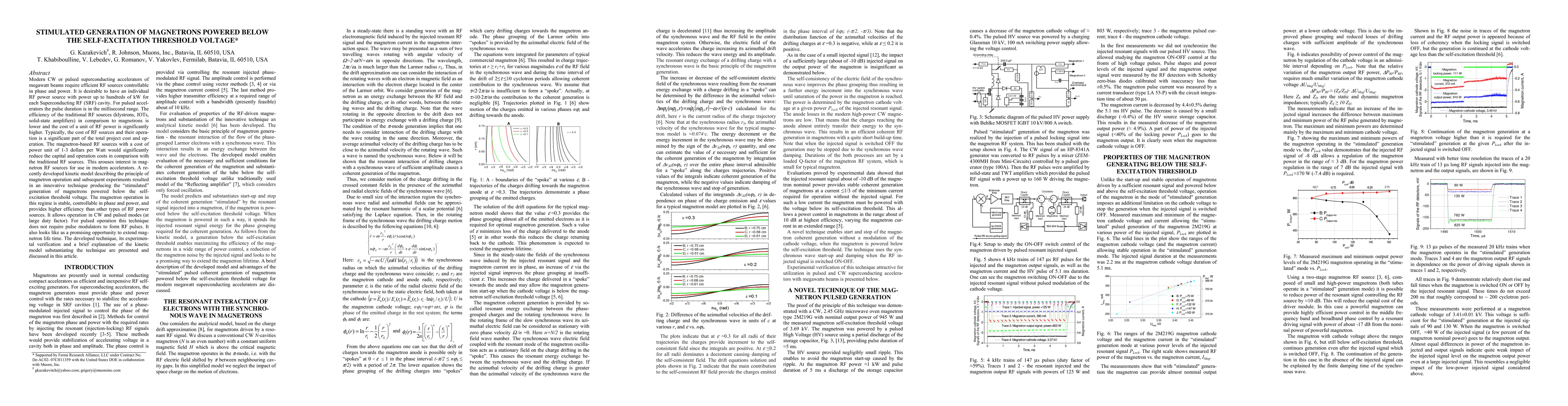 Modern CW or pulsed superconducting accelerators of megawatts beams require efficient RF sources controllable in phase and power. It is desirable to have an individual RF power source with power up to hundreds of kW for each Superconductive RF (SRF) cavity. For pulsed accelerators the pulse duration in millisecond range is required. The efficiency of the traditional RF sources (klystrons, IOTs, solid-state amplifiers) in comparison to magnetrons is lower and the cost of unit of RF power is significantly higher. Typically, the cost of RF sources and their operation is a significant part of the total project cost and operation. The magnetron-based RF sources with a cost of power unit of 1-3 dollars per Watt would significantly reduce the capital and operation costs in comparison with the traditional RF sources. This arouses interest in magnetron RF sources for use in modern accelerators. A recently developed kinetic model describing the principle of magnetron operation and subsequent experiments resulted in an innovative technique producing the "stimulated" generation of magnetrons powered below the self-excitation threshold voltage. The magnetron operation in this regime is stable, low noise, controllable in phase and power, and provides higher efficiency than other types of RF power sources. It allows operation in CW and pulse modes (at large duty factor). For pulsed operation this technique does not require pulse modulators to form RF pulses. It also looks as a promising opportunity to extend magnetron life time. The developed technique, its experimental verification and a brief explanation of the kinetic model substantiating the technique are presented and discussed in this article.