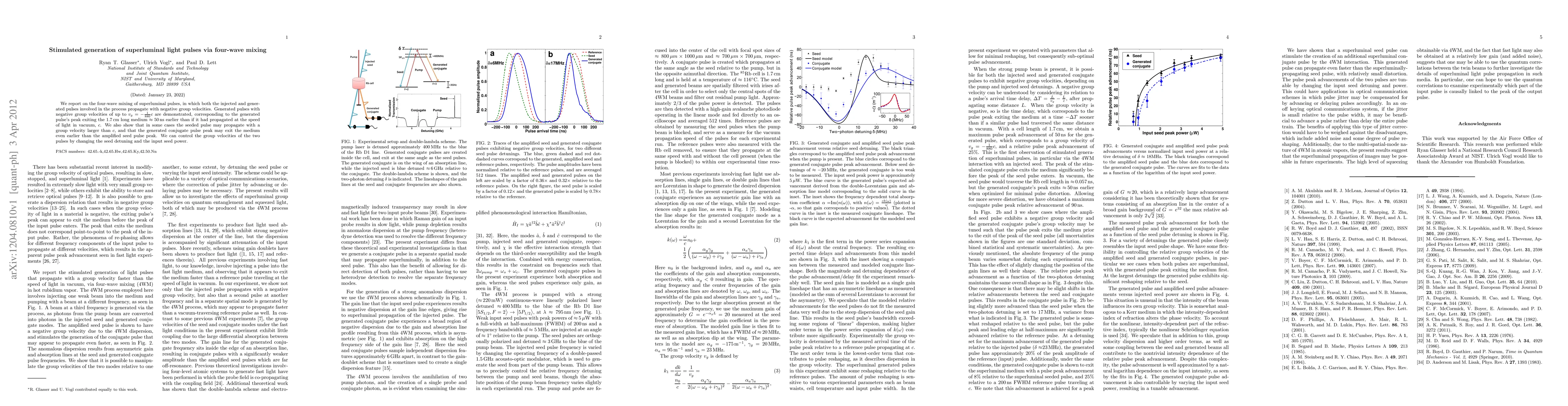 This paper demonstrates the generation of superluminal light pulses via four-wave mixing, where both generated pulses exhibit negative group velocities up to $v_{g}=-1/880c$, allowing the pulse peak to exit the medium 50 ns earlier than light in vacuum. The group velocities can be controlled by adjusting seed detuning and input power.
