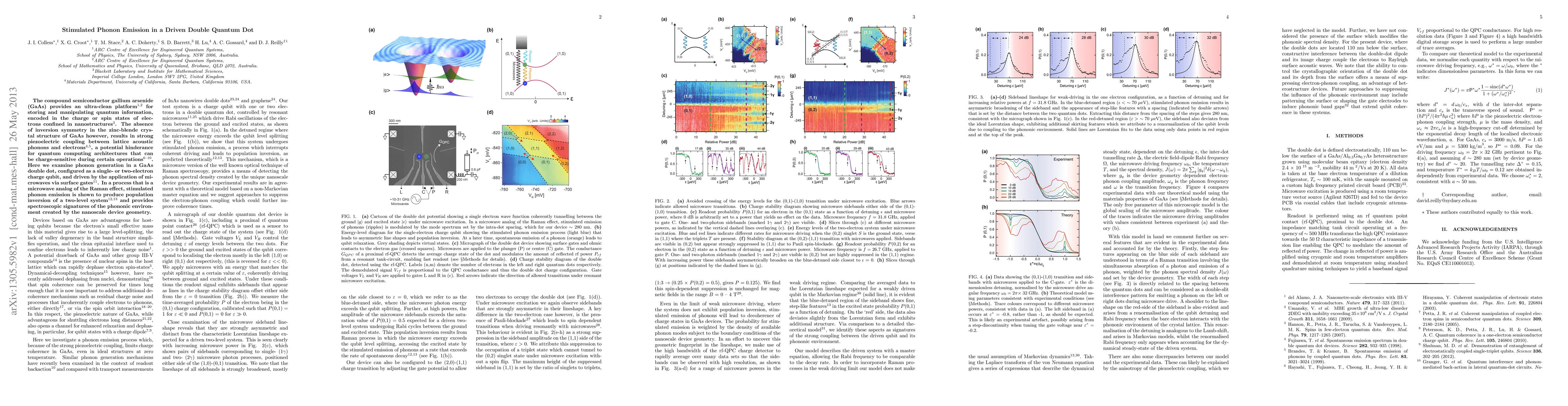 The compound semiconductor gallium arsenide (GaAs) provides an ultra-clean platform for storing and manipulating quantum information, encoded in the charge or spin states of electrons confined in nanostructures. The absence of inversion symmetry in the zinc-blende crystal structure of GaAs however, results in strong piezoelectric coupling between lattice acoustic phonons and electrons, a potential hindrance for quantum computing architectures that can be charge-sensitive during certain operations. Here we examine phonon generation in a GaAs double dot, configured as a single- or two-electron charge qubit, and driven by the application of microwaves via surface gates. In a process that is a microwave analog of the Raman effect, stimulated phonon emission is shown to produce population inversion of a two-level system and provides spectroscopic signatures of the phononic environment created by the nanoscale device geometry.