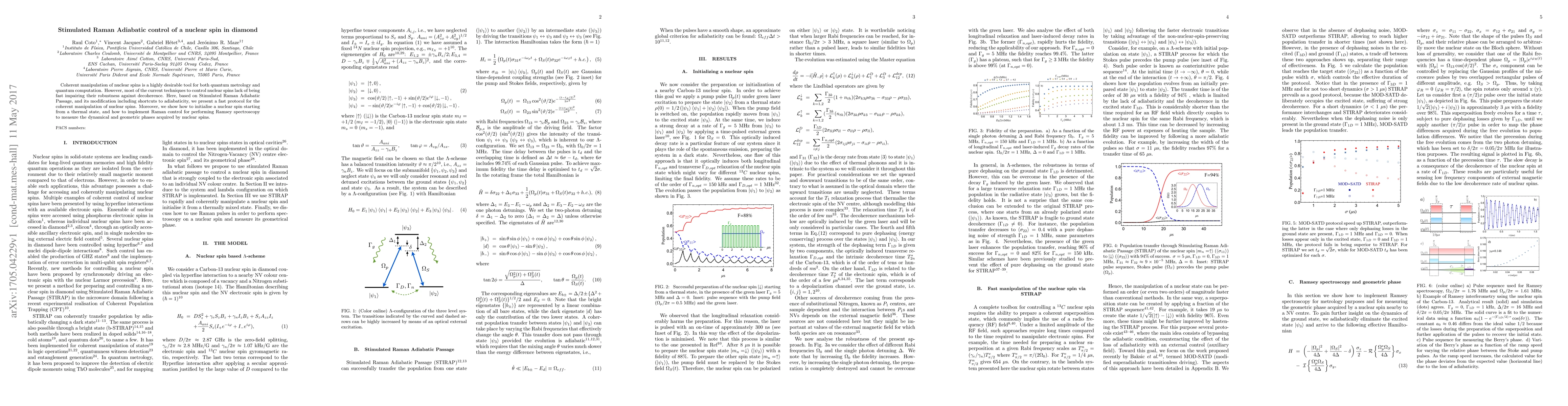 Coherent manipulation of nuclear spins is a highly desirable tool for both quantum metrology and quantum computation. However, most of the current techniques to control nuclear spins lack of being fast impairing their robustness against decoherence. Here, based on Stimulated Raman Adiabatic Passage, and its modification including shortcuts to adiabaticity, we present a fast protocol for the coherent manipulation of nuclear spins. Moreover, we show how to initialise a nuclear spin starting from a thermal state, and how to implement Raman control for performing Ramsey spectroscopy to measure the dynamical and geometric phases acquired by nuclear spins.