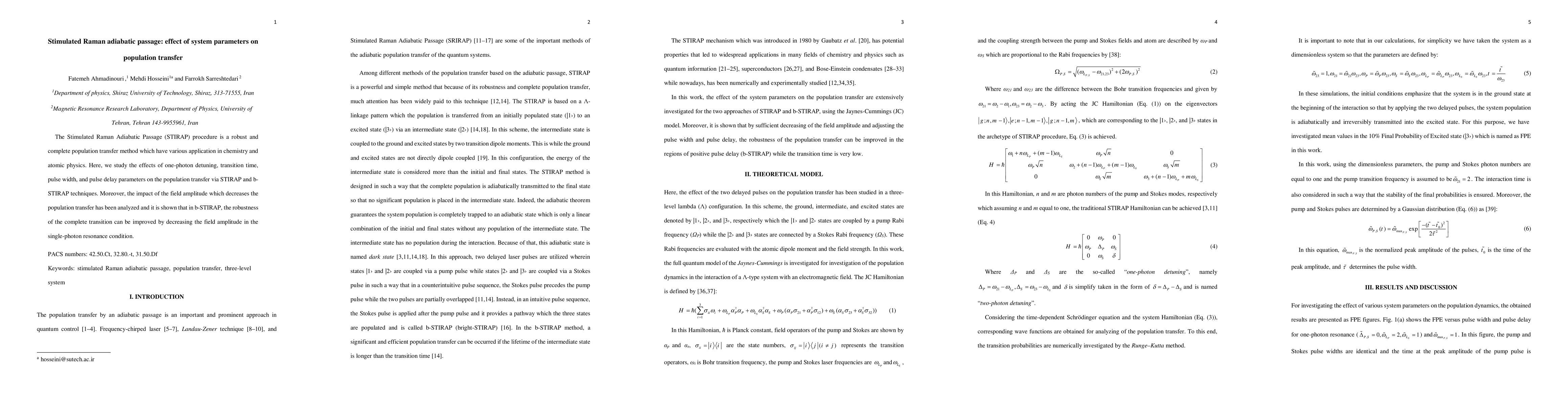 The Stimulated Raman Adiabatic Passage (STIRAP) procedure is a robust and complete population transfer method which have various application in chemistry and atomic physics. Here, we study the effects of one-photon detuning, transition time, pulse width, and pulse delay parameters on the population transfer via STIRAP and b-STIRAP techniques. Moreover, the impact of the field amplitude which decreases the population transfer has been analyzed and it is shown that in b-STIRAP, the robustness of the complete transition can be improved by decreasing the field amplitude in the single-photon resonance condition.