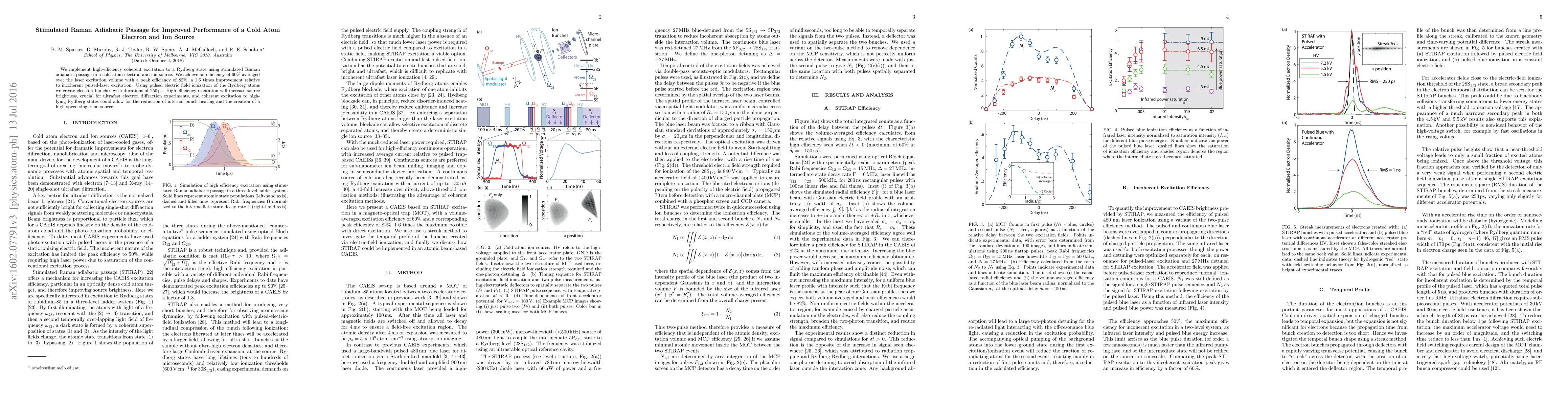 This paper details the implementation of stimulated Raman adiabatic passage to achieve high-efficiency coherent excitation of Rydberg states in a cold atom electron and ion source, achieving an efficiency of 60% with a peak of 82%. This method improves upon incoherent pulsed-laser excitation and enables the creation of electron bunches with 250 ps durations, enhancing source brightness for ultrafast electron diffraction experiments.