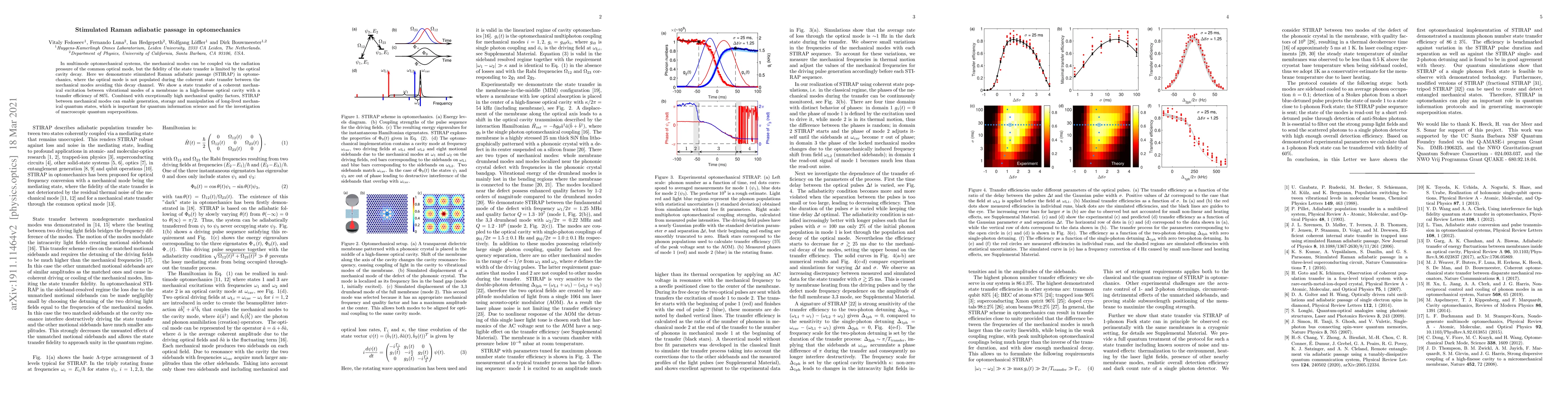 This paper demonstrates stimulated Raman adiabatic passage (STIRAP) in an optomechanical system, achieving 86% efficiency in transferring population between two mechanical modes. The use of an optical cavity mode for mediation ensures robustness against photon loss, promising potential for macroscopic quantum superposition and quantum information protocols.
