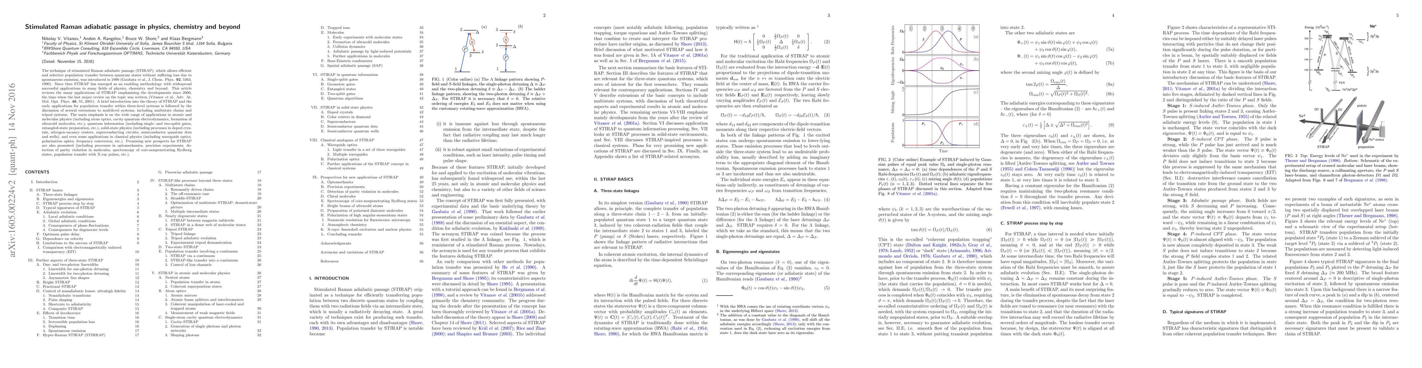 The technique of stimulated Raman adiabatic passage (STIRAP), which allows efficient and selective population transfer between quantum states without suffering loss due to spontaneous emission, was introduced in 1990 (Gaubatz \emph{et al.}, J. Chem. Phys. \textbf{92}, 5363, 1990). Since then STIRAP has emerged as an enabling methodology with widespread successful applications in many fields of physics, chemistry and beyond. This article reviews the many applications of STIRAP emphasizing the developments since 2000, the time when the last major review on the topic was written (Vitanov \emph{et al.}, Adv. At. Mol. Opt. Phys. \textbf{46}, 55, 2001). A brief introduction into the theory of STIRAP and the early applications for population transfer within three-level systems is followed by the discussion of several extensions to multi-level systems, including multistate chains and tripod systems. The main emphasis is on the wide range of applications in atomic and molecular physics (including atom optics, cavity quantum electrodynamics, formation of ultracold molecules, precision experiments, etc.), quantum information (including single- and two-qubit gates, entangled-state preparation, etc.), solid-state physics (including processes in doped crystals, nitrogen-vacancy centers, superconducting circuits, etc.), and even some applications in classical physics (including waveguide optics, frequency conversion, polarization optics, etc.). Promising new prospects for STIRAP are also presented (including processes in optomechanics, detection of parity violation in molecules, spectroscopy of core-nonpenetrating Rydberg states, and population transfer with X-ray pulses).