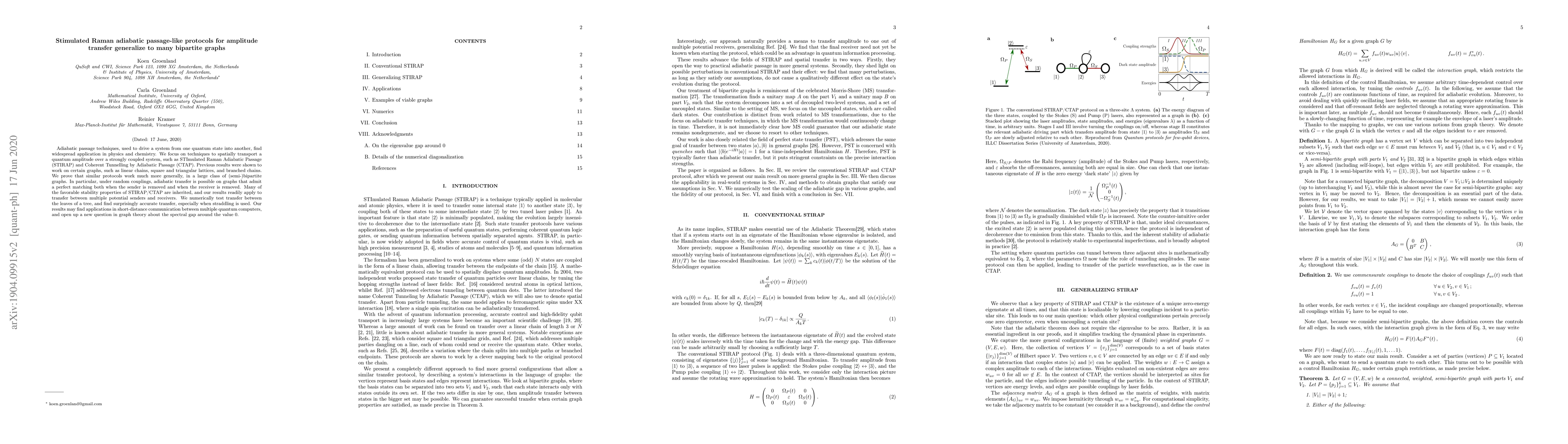 Adiabatic passage techniques, used to drive a system from one quantum state into another, find widespread application in physics and chemistry. We focus on techniques to spatially transport a quantum amplitude over a strongly coupled system, such as STImulated Raman Adiabatic Passage (STIRAP) and Coherent Tunnelling by Adiabatic Passage (CTAP). Previous results were shown to work on certain graphs, such as linear chains, square and triangular lattices, and branched chains. We prove that similar protocols work much more generally, in a large class of (semi-)bipartite graphs. In particular, under random couplings, adiabatic transfer is possible on graphs that admit a perfect matching both when the sender is removed and when the receiver is removed. Many of the favorable stability properties of STIRAP/CTAP are inherited, and our results readily apply to transfer between multiple potential senders and receivers. We numerically test transfer between the leaves of a tree, and find surprisingly accurate transfer, especially when straddling is used. Our results may find applications in short-distance communication between multiple quantum computers, and open up a new question in graph theory about the spectral gap around the value 0.