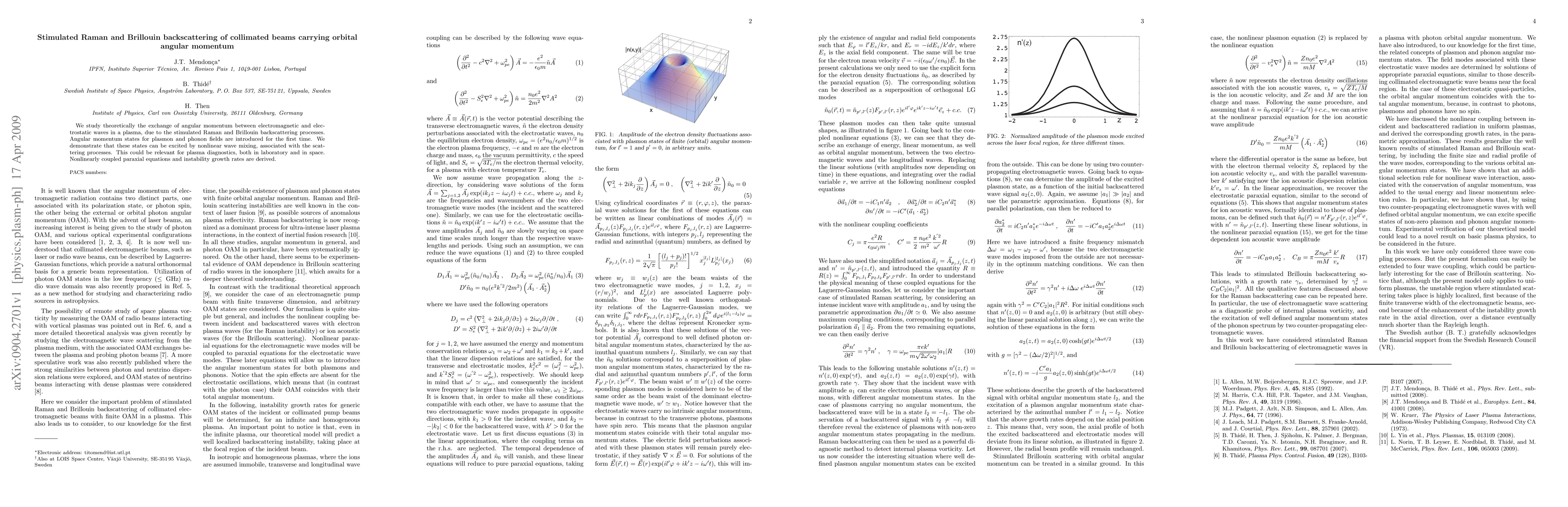This paper theoretically investigates the stimulated Raman and Brillouin backscattering in plasma, focusing on the exchange of angular momentum between electromagnetic and electrostatic waves. It introduces novel angular momentum states for plasmon and phonon fields, excited via nonlinear wave mixing, which may enhance plasma diagnostics.