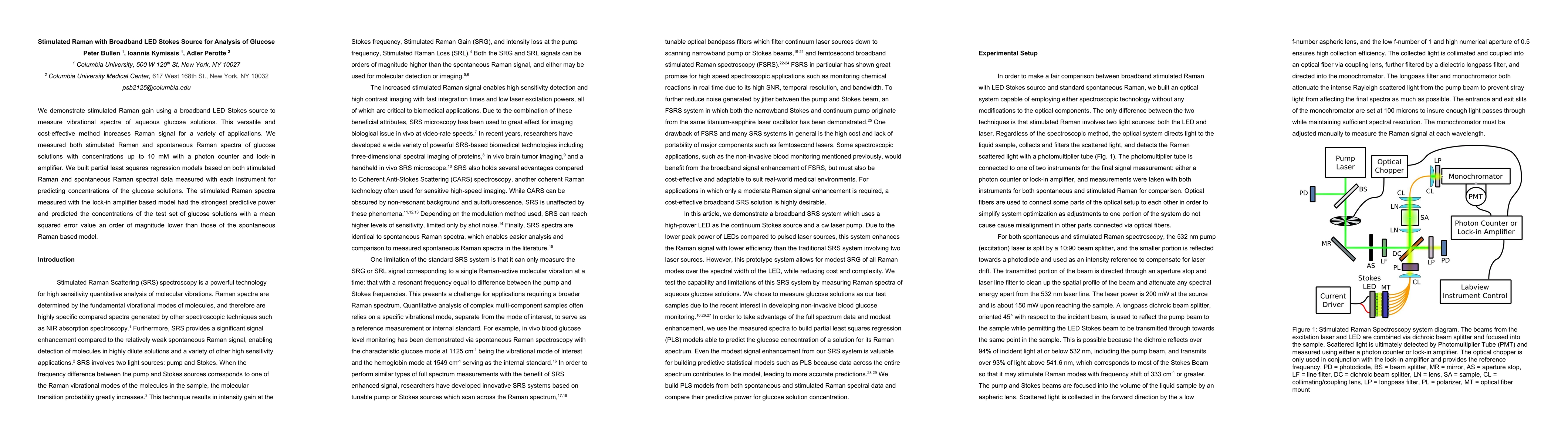 This paper demonstrates a cost-effective method using stimulated Raman gain with a broadband LED Stokes source to analyze aqueous glucose solutions, achieving significantly better predictive accuracy for glucose concentrations compared to spontaneous Raman spectroscopy. The stimulated Raman method shows a mean squared error an order of magnitude lower, indicating superior performance.