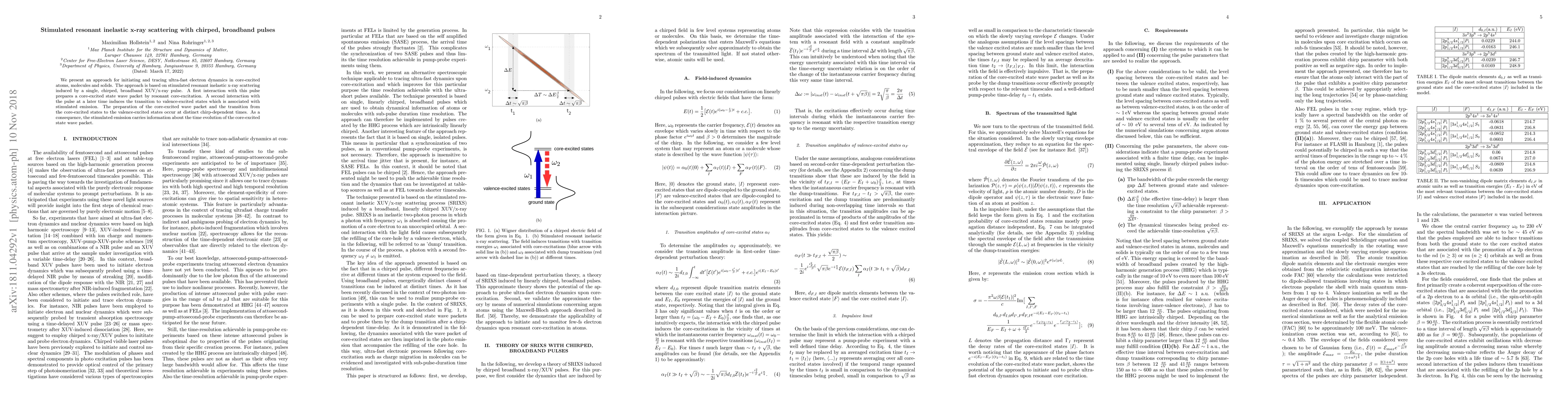 This study proposes a method using chirped, broadband XUV/x-ray pulses to initiate and track ultra-fast electron dynamics in core-excited atoms and molecules via stimulated resonant inelastic x-ray scattering, revealing time-dependent evolution of core-excited states through distinct chirp-dependent interactions.