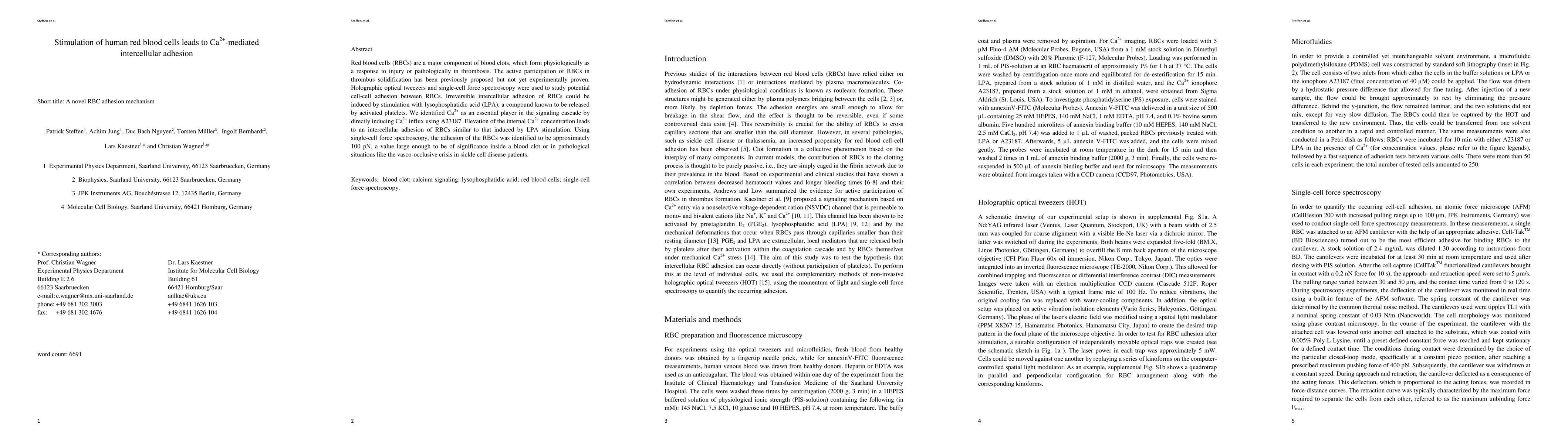 This study demonstrates that stimulation of human red blood cells with lysophosphatidic acid induces Ca2+-mediated irreversible intercellular adhesion, crucial for thrombus formation, using holographic optical tweezers and single-cell force spectroscopy. Elevated Ca2+ concentration mimics this adhesion, suggesting its significance in blood clot formation and sickle cell disease.
