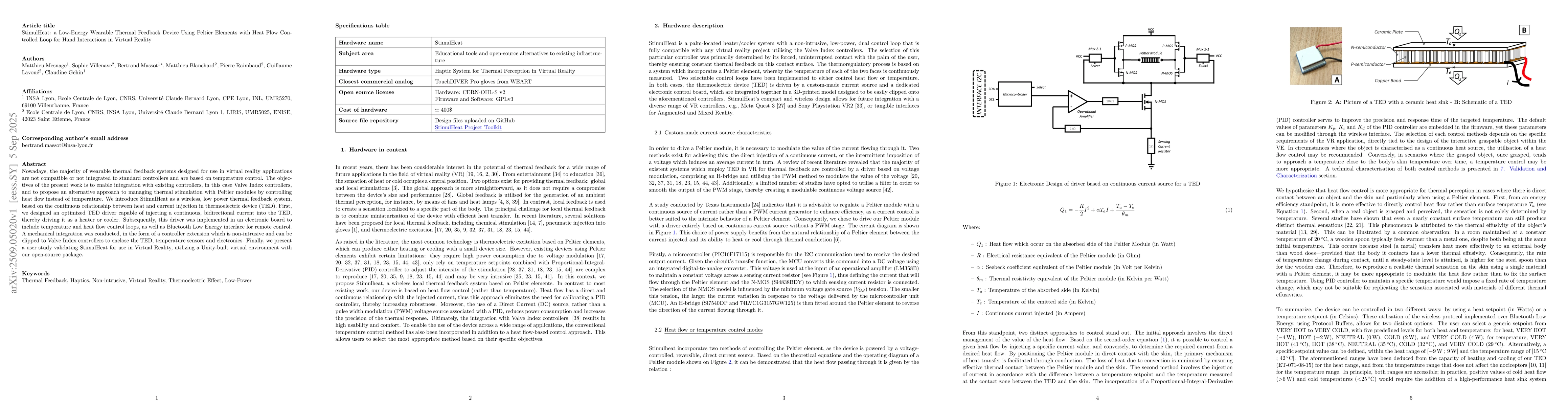 Nowadays, the majority of wearable thermal feedback systems designed for use in virtual reality applications are not compatible or not integrated to standard controllers and are based on temperature control. The objectives of the present work is to enable integration with existing controllers, in this case Valve Index controllers, and to propose an alternative approach to managing thermal stimulation with Peltier modules by controlling heat flow instead of temperature. We introduce StimulHeat as a wireless, low power thermal feedback system, based on the continuous relationship between heat and current injection in thermoelectric device (TED). First, we designed an optimized TED driver capable of injecting a continuous, bidirectional current into the TED, thereby driving it as a heater or cooler. Subsequently, this driver was implemented in an electronic board to include temperature and heat flow control loops, as well as Bluetooth Low Energy interface for remote control. A mechanical integration was conducted, in the form of a controller extension which is non-intrusive and can be clipped to Valve Index controllers to enclose the TED, temperature sensors and electronics. Finally, we present a user study validating StimulHeat for use in Virtual Reality, utilizing a Unity-built virtual environment with our open-source package.