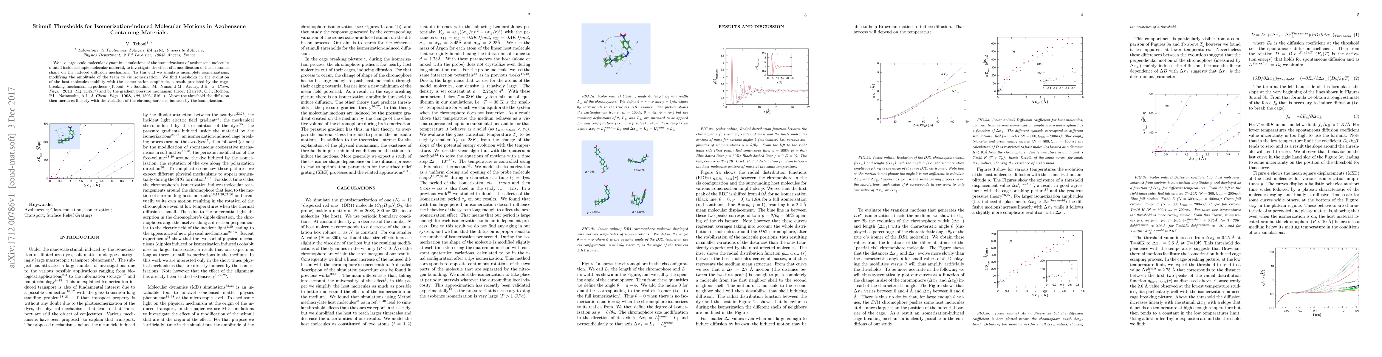 We use large scale molecular dynamics simulations of the isomerizations of azobenzene molecules diluted inside a simple molecular material, to investigate the effect of a modification of the cis isomer shape on the induced diffusion mechanism. To this end we simulate incomplete isomerizations, modifying the amplitude of the trans to cis isomerization. We find thresholds in the evolution of the host molecules mobility with the isomerization amplitude, a result predicted by the cage- breaking mechanism hypothesis (Teboul, V.; Saiddine, M.; Nunzi, J.M.; Accary, J.B. J. Chem. Phys. 2011, 134, 114517) and by the gradient pressure mechanism theory (Barrett, C.J.; Rochon, P.L.; Natansohn, A.L. J. Chem. Phys. 1998, 109, 1505-1516. ). Above the threshold the diffusion then increases linearly with the variation of the chromophore size induced by the isomerization.