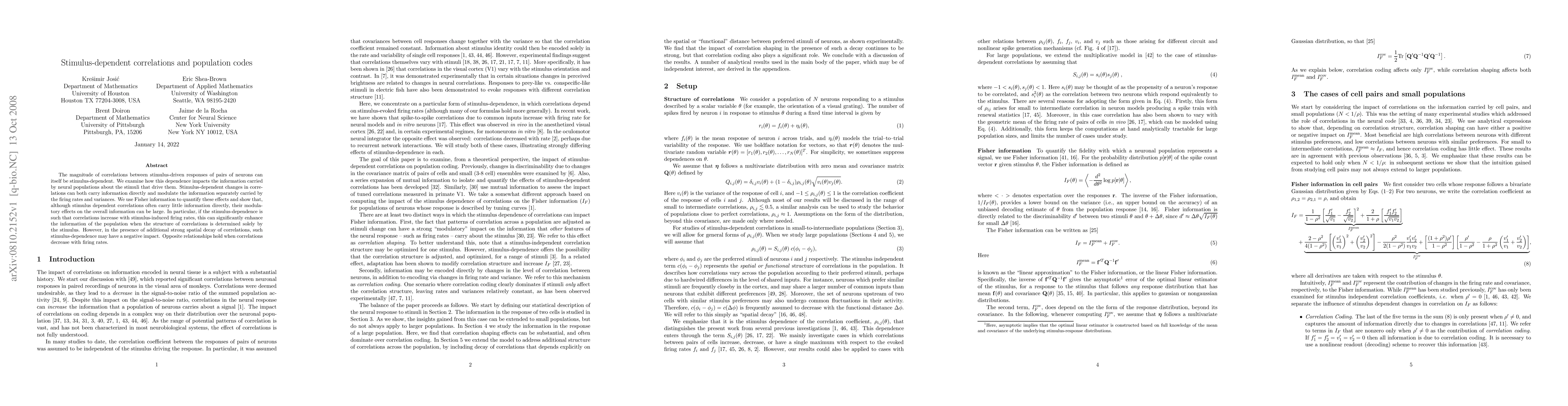 This paper investigates how stimulus-dependent correlations between neurons affect the information conveyed by neural populations. While stimulus-dependent correlations often carry little direct information, they significantly modulate the overall information content, especially when they enhance firing rates in response to stimuli. However, spatial decay of correlations can negate these benefits.