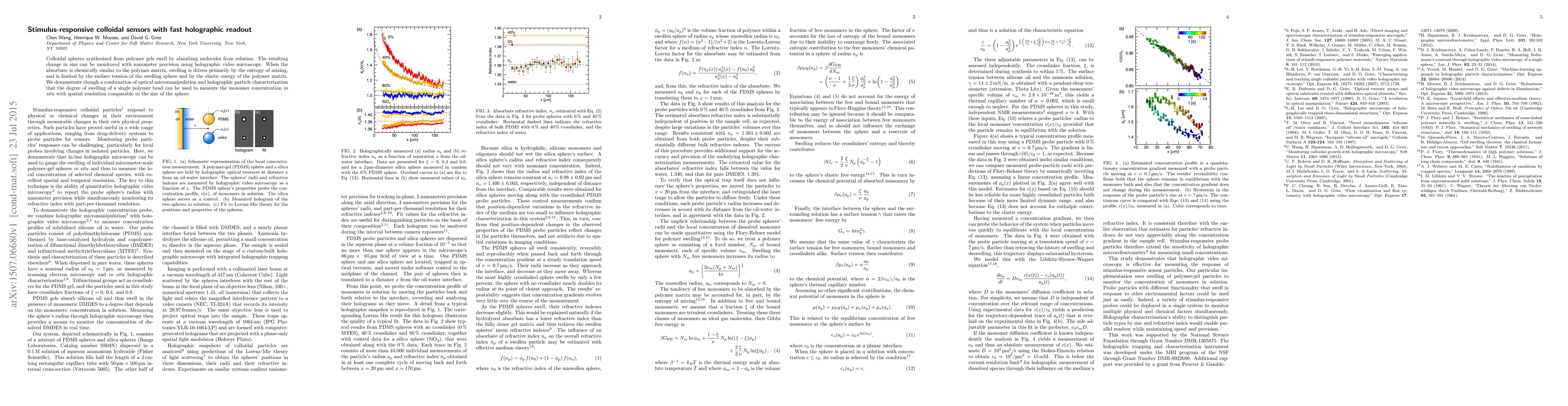 This paper presents colloidal sensors made from polymer gel spheres that swell in response to absorbing molecules, enabling precise size monitoring via holographic video microscopy. The study demonstrates that the swelling degree of a single polymer bead can accurately measure monomer concentration in situ with high spatial resolution.
