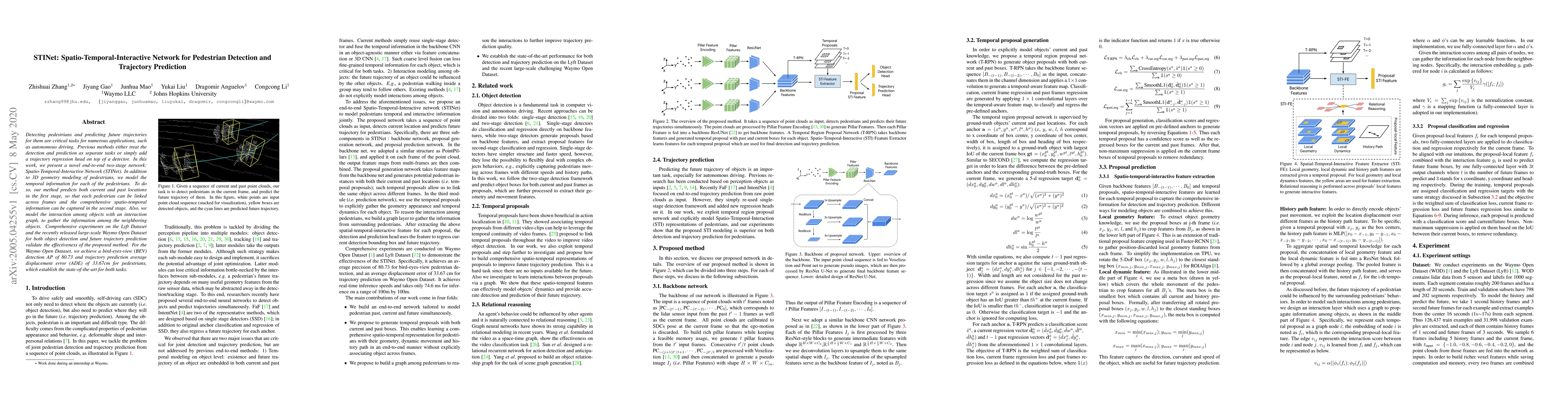 Detecting pedestrians and predicting future trajectories for them are critical tasks for numerous applications, such as autonomous driving. Previous methods either treat the detection and prediction as separate tasks or simply add a trajectory regression head on top of a detector. In this work, we present a novel end-to-end two-stage network: Spatio-Temporal-Interactive Network (STINet). In addition to 3D geometry modeling of pedestrians, we model the temporal information for each of the pedestrians. To do so, our method predicts both current and past locations in the first stage, so that each pedestrian can be linked across frames and the comprehensive spatio-temporal information can be captured in the second stage. Also, we model the interaction among objects with an interaction graph, to gather the information among the neighboring objects. Comprehensive experiments on the Lyft Dataset and the recently released large-scale Waymo Open Dataset for both object detection and future trajectory prediction validate the effectiveness of the proposed method. For the Waymo Open Dataset, we achieve a bird-eyes-view (BEV) detection AP of 80.73 and trajectory prediction average displacement error (ADE) of 33.67cm for pedestrians, which establish the state-of-the-art for both tasks.