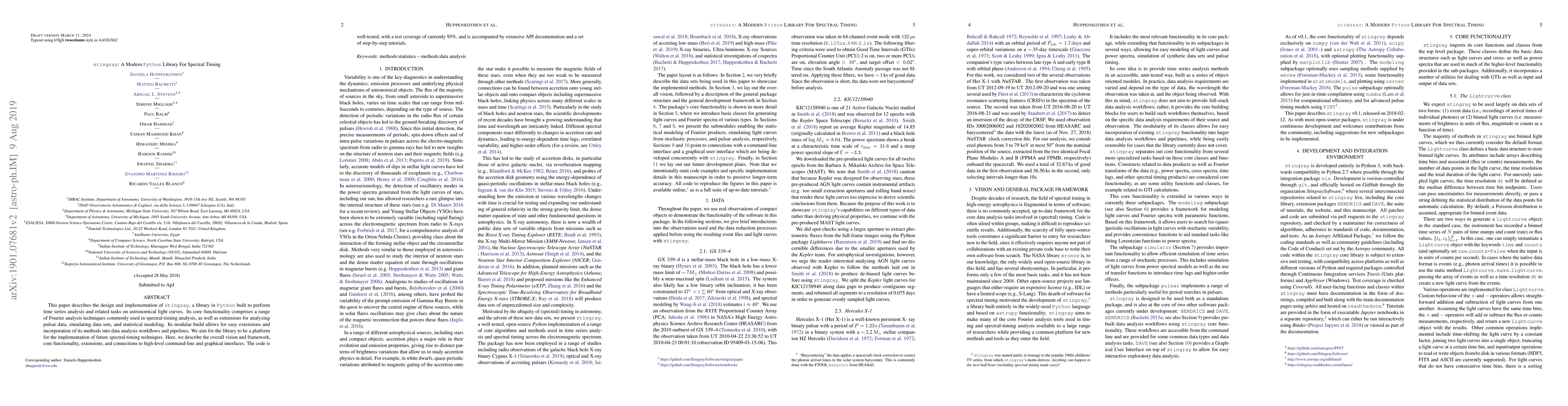 Stingray is a Python library designed for time series analysis of astronomical light curves, featuring advanced Fourier analysis and tools for spectral-timing, pulsar data, and statistical modeling. It is modular, well-documented, and has a high test coverage of 95%.