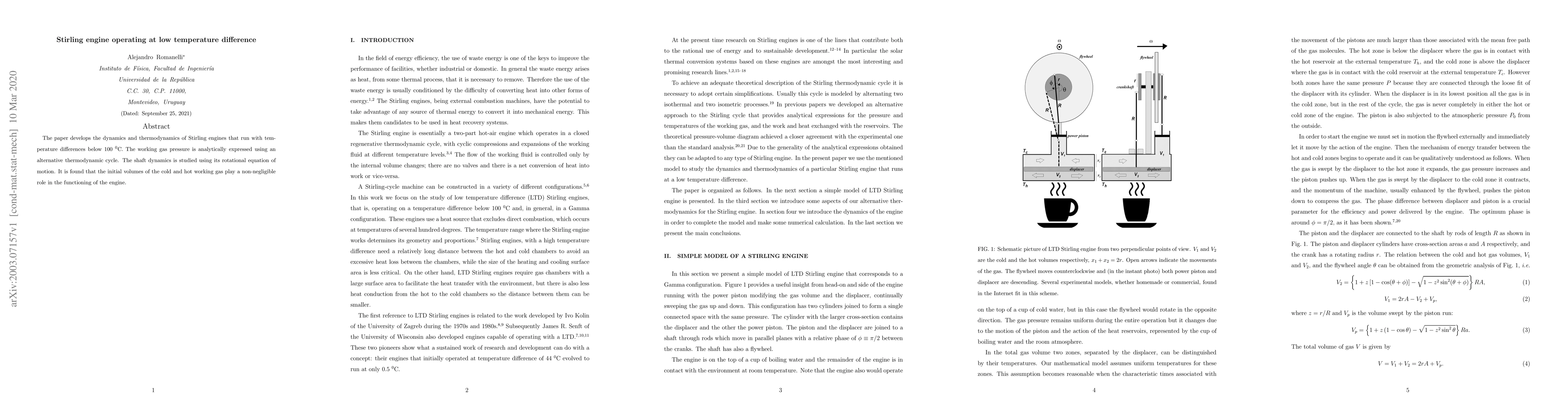 This paper investigates the dynamics and thermodynamics of Stirling engines operating with temperature differences below 100°C, revealing that the initial volumes of cold and hot working gases significantly affect engine performance. The study employs an alternative thermodynamic cycle and rotational dynamics to analyze the engine's behavior.