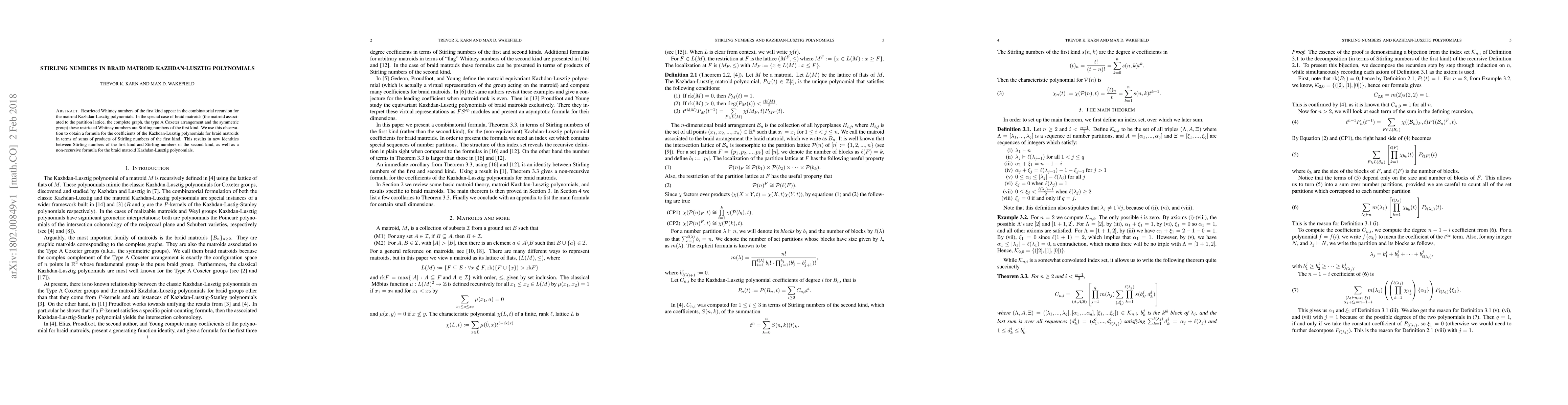 This paper connects Stirling numbers of the first kind to the restricted Whitney numbers in braid matroid Kazhdan-Lusztig polynomials, deriving new identities and a non-recursive formula for the latter in terms of sums of products of the former.
