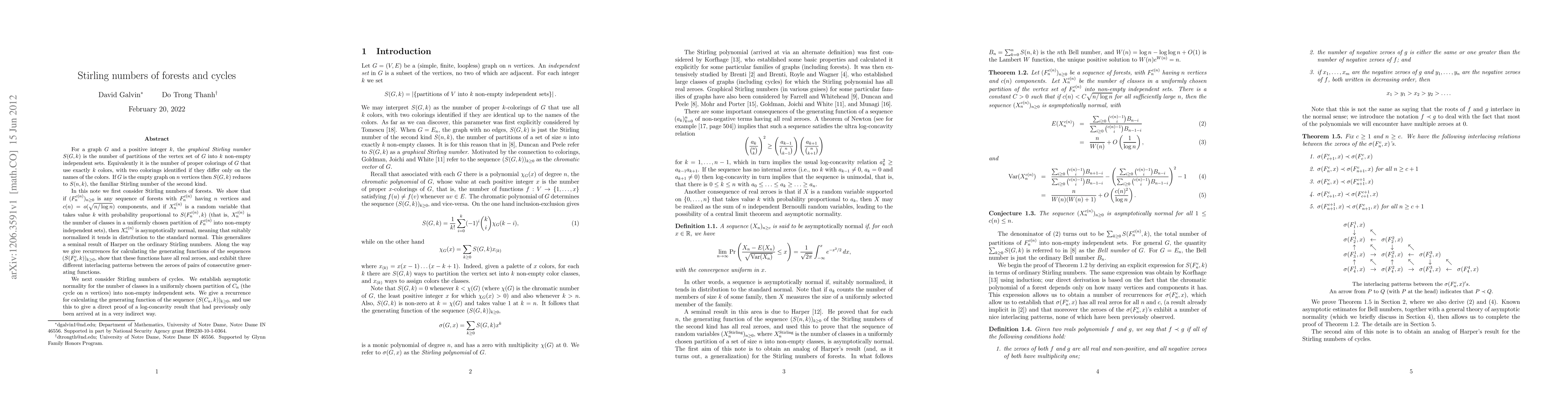 For a graph $G$ and a positive integer $k$, the {\em graphical Stirling number} $S(G,k)$ is the number of partitions of the vertex set of $G$ into $k$ non-empty independent sets. Equivalently it is the number of proper colorings of $G$ that use exactly $k$ colors, with two colorings identified if they differ only on the names of the colors. If $G$ is the empty graph on $n$ vertices then $S(G,k)$ reduces to $S(n,k)$, the familiar Stirling number of the second kind. In this note we first consider Stirling numbers of forests. We show that if $(F^{c(n)}_n)_{n\geq 0}$ is any sequence of forests with $F^{c(n)}_n$ having $n$ vertices and $c(n)=o(\sqrt{n/\log n})$ components, and if $X^{c(n)}_n$ is a random variable that takes value $k$ with probability proportional to $S(F^{c(n)}_n,k)$ (that is, $X^{c(n)}_n$ is the number of classes in a uniformly chosen partition of $F^{c(n)}_n$ into non-empty independent sets), then $X^{c(n)}_n$ is asymptotically normal, meaning that suitably normalized it tends in distribution to the standard normal. This generalizes a seminal result of Harper on the ordinary Stirling numbers. Along the way we give recurrences for calculating the generating functions of the sequences $(S(F^c_n,k))_{k \geq 0}$, show that these functions have all real zeroes, and exhibit three different interlacing patterns between the zeroes of pairs of consecutive generating functions. We next consider Stirling numbers of cycles. We establish asymptotic normality for the number of classes in a uniformly chosen partition of $C_n$ (the cycle on $n$ vertices) into non-empty independent sets. We give a recurrence for calculating the generating function of the sequence $(S(C_n,k))_{k \geq 0}$, and use this to give a direct proof of a log-concavity result that had previously only been arrived at in a very indirect way.