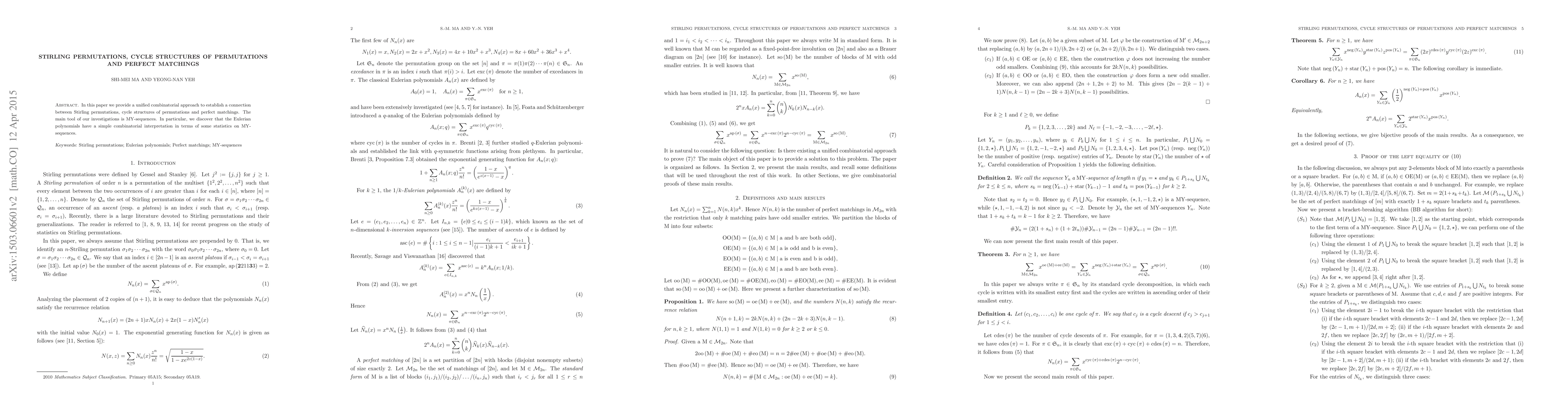 This paper establishes a unified combinatorial framework linking Stirling permutations, cycle structures of permutations, and perfect matchings, using MY-sequences as a key tool. It reveals that Eulerian polynomials can be interpreted via statistics on MY-sequences.