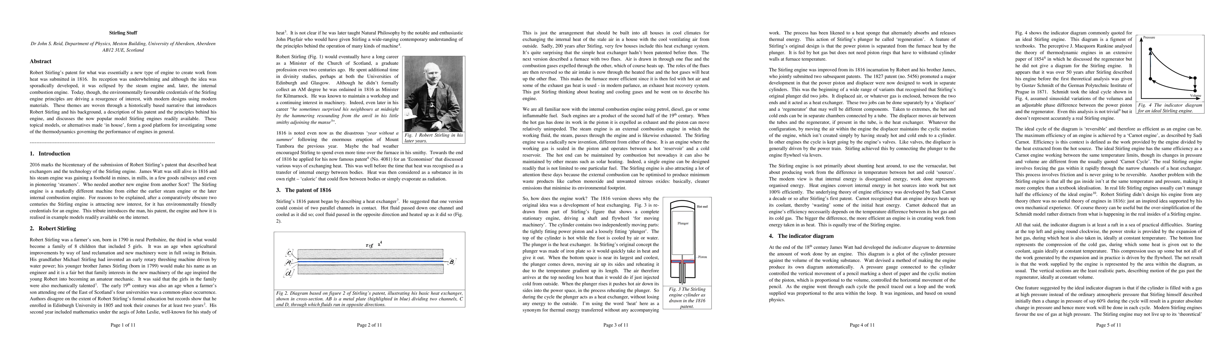 Robert Stirling's patent for what was essentially a new type of engine to create work from heat was submitted in 1816. Its reception was underwhelming and although the idea was sporadically developed, it was eclipsed by the steam engine and, later, the internal combustion engine. Today, though, the environmentally favourable credentials of the Stirling engine principles are driving a resurgence of interest, with modern designs using modern materials. These themes are woven through a historically based narrative that introduces Robert Stirling and his background, a description of his patent and the principles behind his engine, and discusses the now popular model Stirling engines readily available. These topical models, or alternatives made 'in house', form a good platform for investigating some of the thermodynamics governing the performance of engines in general.