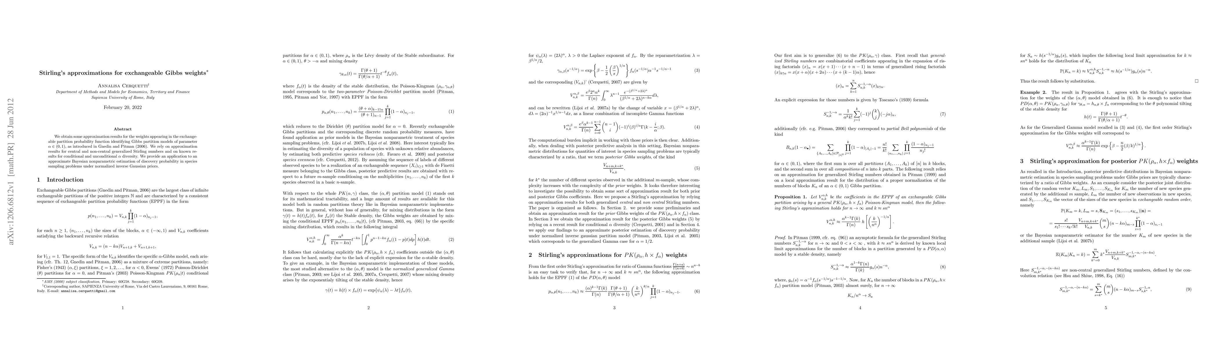 We obtain some approximation results for the weights appearing in the exchangeable partition probability function identifying Gibbs partition models of parameter $\alpha \in (0,1)$, as introduced in Gnedin and Pitman (2006). We rely on approximation results for central and non-central generalized Stirling numbers and on known results for conditional and unconditional $\alpha$ diversity. We provide an application to an approximate Bayesian nonparametric estimation of discovery probability in species sampling problems under normalized inverse Gaussian priors.