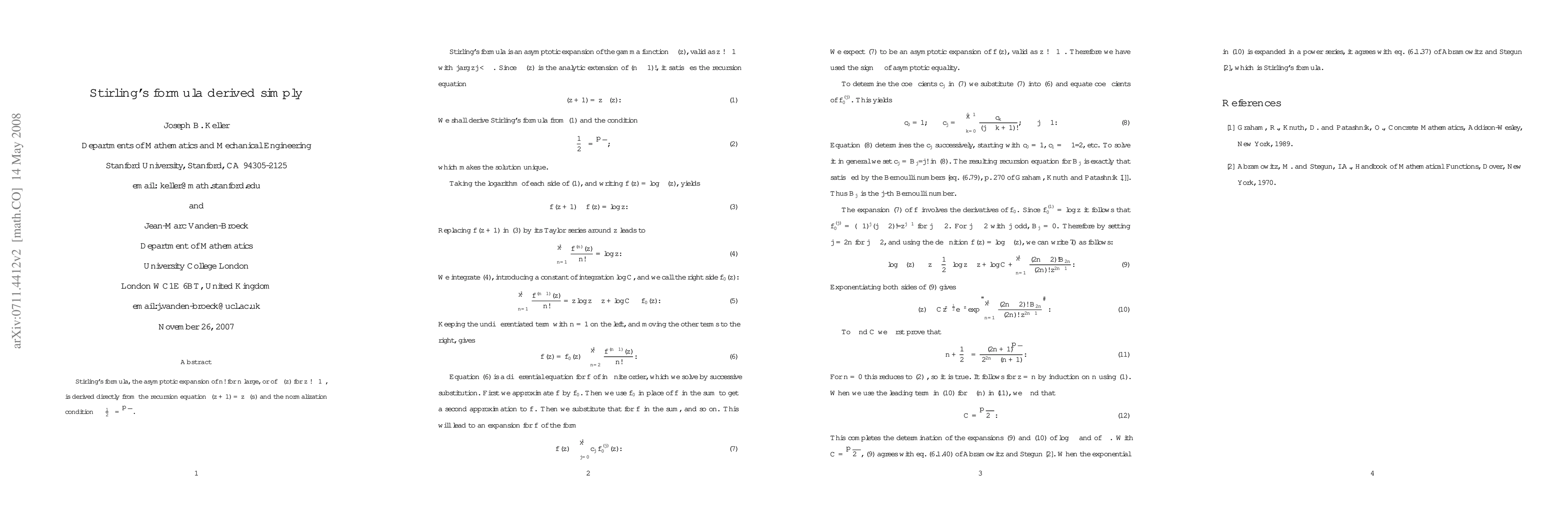 Stirling's formula, the asymptotic expansion of $n!$ for $n$ large, or of $\Gamma(z)$ for $z\to \infty$, is derived directly from the recursion equation $\Gamma(z+1) =z \Gamma(s)$ and the normalization condition $\Gamma ({1/2}) =\sqrt{\pi}$.