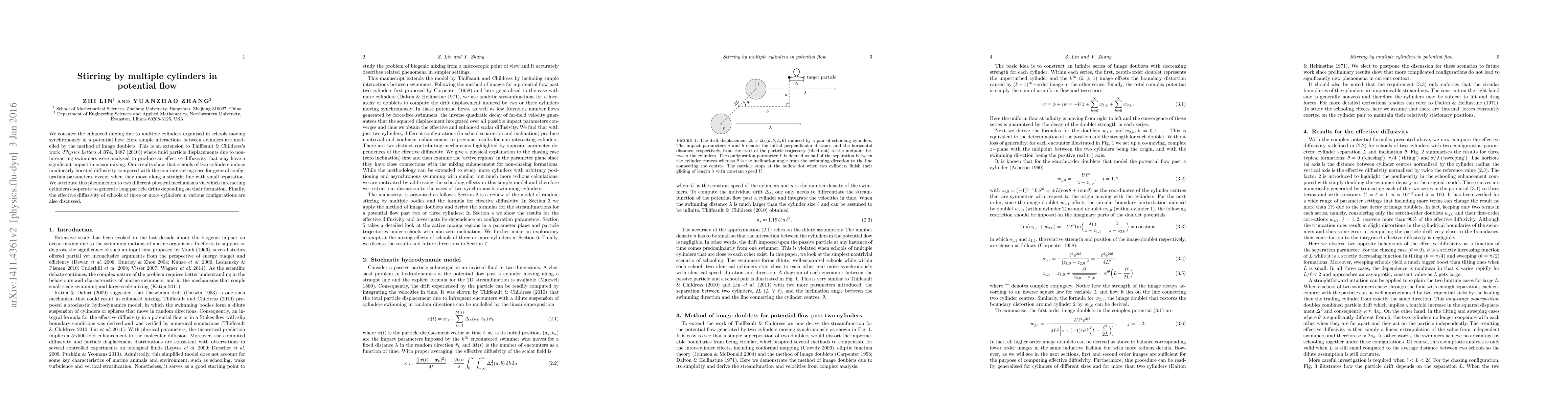 We consider the enhanced mixing due to multiple cylinders organised in schools moving synchronously in a potential flow. Here simple interactions between cylinders are modelled by the method of image doublets. This is an extension to Thiffeault \& Childress's work [\emph{Physics Letters A} \textbf{374}, 3487 (2010)] where fluid particle displacements due to non-interacting swimmers were analysed to produce an effective diffusivity that may have a significant impact in ocean mixing. Our results show that schools of two cylinders induce nonlinearly boosted diffusivity compared with the non-interacting case for general configuration parameters, except when they move along a straight line with small separation. We attribute this phenomenon to two different physical mechanisms via which interacting cylinders cooperate to generate long particle drifts depending on their formation. Finally, the effective diffusivity of schools of three or more cylinders in various configurations are also discussed.