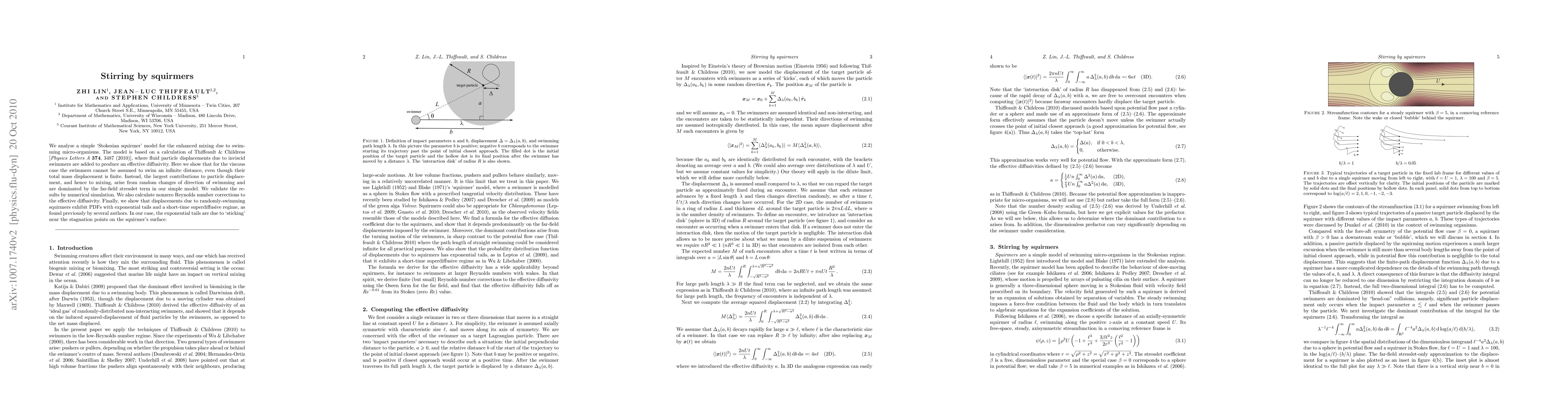 We analyse a simple 'Stokesian squirmer' model for the enhanced mixing due to swimming micro-organisms. The model is based on a calculation of Thiffeault & Childress [Physics Letters A, 374, 3487 (2010), arXiv:0911.5511], where fluid particle displacements due to inviscid swimmers are added to produce an effective diffusivity. Here we show that for the viscous case the swimmers cannot be assumed to swim an infinite distance, even though their total mass displacement is finite. Instead, the largest contributions to particle displacement, and hence to mixing, arise from random changes of direction of swimming and are dominated by the far-field stresslet term in our simple model. We validate the results by numerical simulation. We also calculate nonzero Reynolds number corrections to the effective diffusivity. Finally, we show that displacements due to randomly-swimming squirmers exhibit PDFs with exponential tails and a short-time superdiffusive regime, as found previously by several authors. In our case, the exponential tails are due to 'sticking' near the stagnation points on the squirmer's surface.