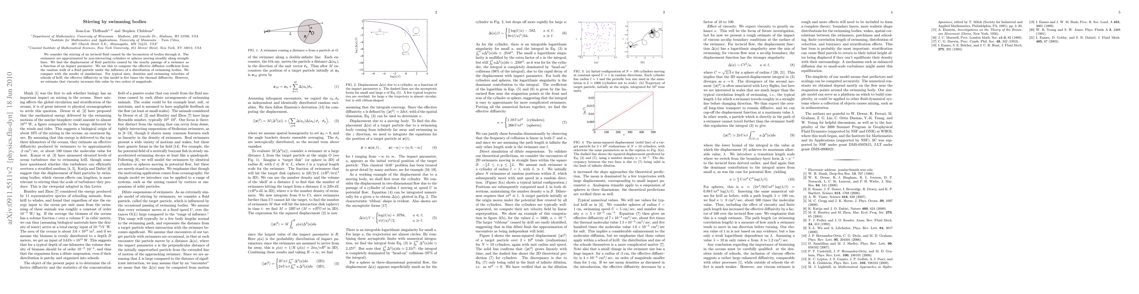 We consider the stirring of an inviscid fluid caused by the locomotion of bodies through it. The swimmers are approximated by non-interacting cylinders or spheres moving steadily along straight lines. We find the displacement of fluid particles caused by the nearby passage of a swimmer as a function of an impact parameter. We use this to compute the effective diffusion coefficient from the random walk of a fluid particle under the influence of a distribution of swimming bodies. We compare with the results of simulations. For typical sizes, densities and swimming velocities of schools of krill, the effective diffusivity in this model is five times the thermal diffusivity. However, we estimate that viscosity increases this value by two orders of magnitude.