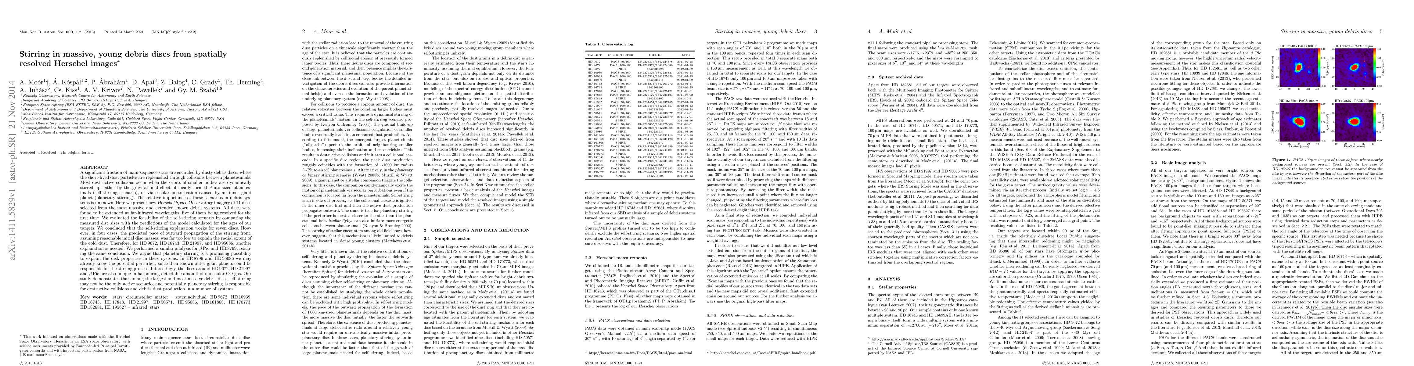 This study uses Herschel Space Observatory imagery to analyze the dynamics of massive, young debris discs around main-sequence stars, finding that self-stirring by planetesimals works for seven discs but not for four, where planetary stirring by giant planets is likely responsible for the observed disc extents.