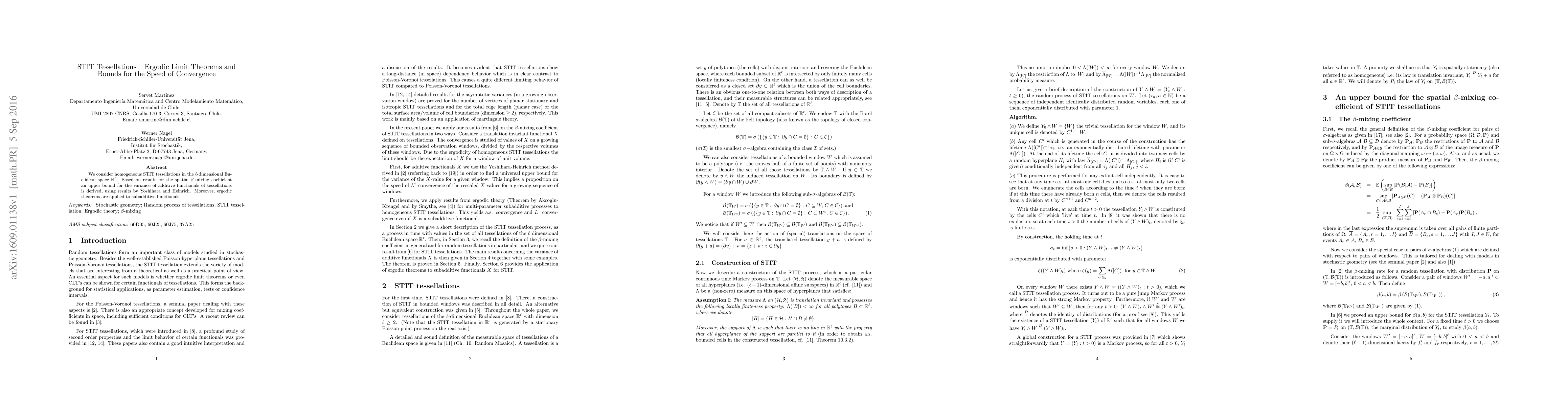 This paper explores homogeneous STIT tessellations in $\mathbb{R}^\ell$ and derives an upper bound for the variance of additive functionals using spatial $\beta$-mixing coefficients. It also applies ergodic theorems to subadditive functionals to establish convergence rates.