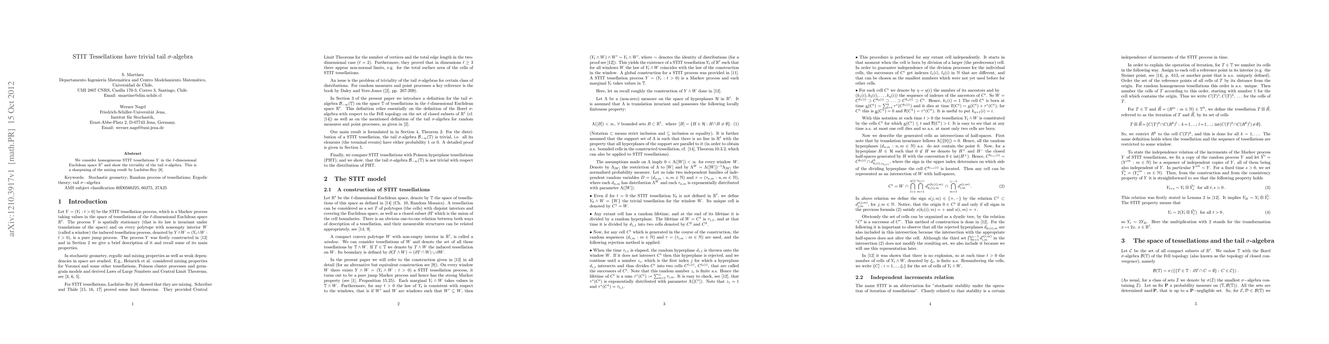 We consider homogeneous STIT tessellations Y in the \ell-dimensional Euclidean space and show the triviality of the tail \sigma-algebra. This is a sharpening of the mixing result by Lachi\`eze-Rey.