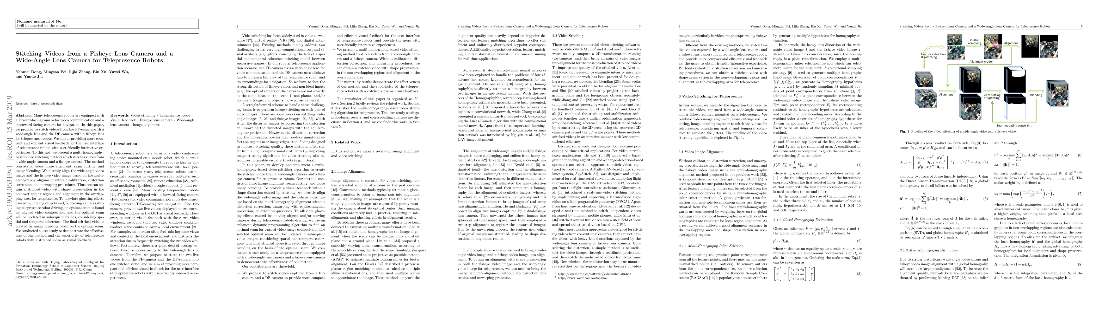 This paper proposes a multi-homography-based method for stitching videos from a wide-angle and a fisheye lens camera for telepresence robots, aiming to provide compact and efficient visual feedback. The method includes image alignment, seam cutting, and blending, achieving shape preservation and alignment without calibration, and it updates optimal seams to reduce ghosting effects.