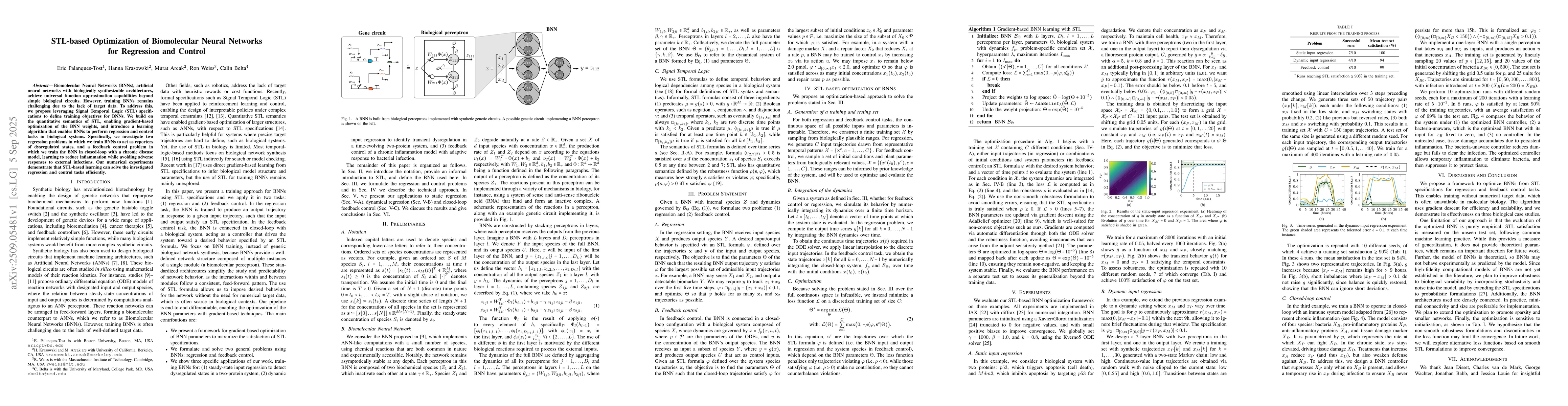 Biomolecular Neural Networks (BNNs), artificial neural networks with biologically synthesizable architectures, achieve universal function approximation capabilities beyond simple biological circuits. However, training BNNs remains challenging due to the lack of target data. To address this, we propose leveraging Signal Temporal Logic (STL) specifications to define training objectives for BNNs. We build on the quantitative semantics of STL, enabling gradient-based optimization of the BNN weights, and introduce a learning algorithm that enables BNNs to perform regression and control tasks in biological systems. Specifically, we investigate two regression problems in which we train BNNs to act as reporters of dysregulated states, and a feedback control problem in which we train the BNN in closed-loop with a chronic disease model, learning to reduce inflammation while avoiding adverse responses to external infections. Our numerical experiments demonstrate that STL-based learning can solve the investigated regression and control tasks efficiently.