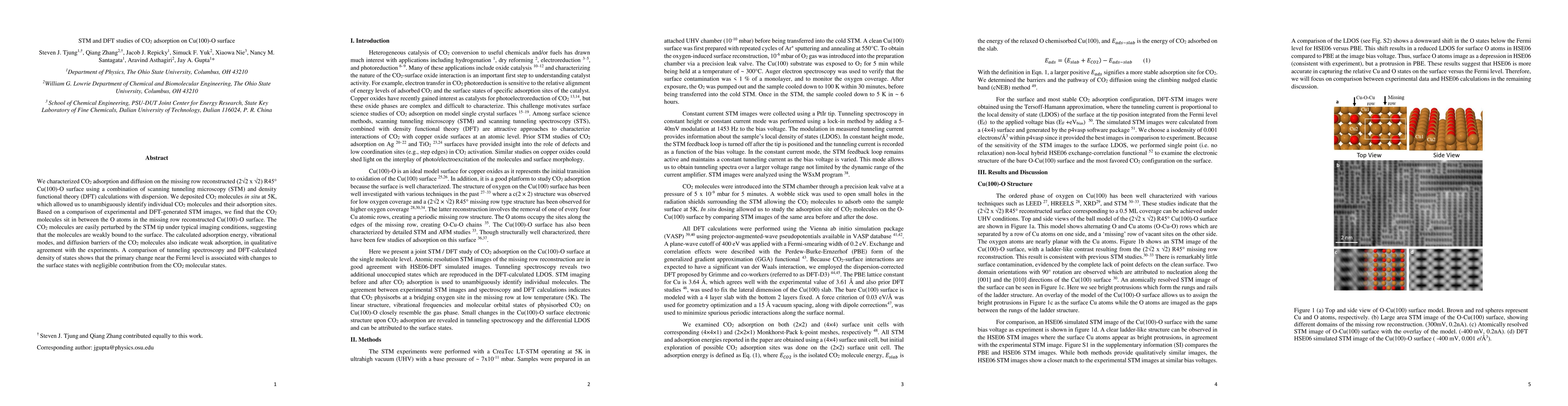 This study combines STM and DFT to investigate CO2 adsorption on Cu(100)-O surface, finding that CO2 molecules weakly bind between O atoms in the missing row reconstruction, with minimal impact on the surface electronic states. The weak adsorption is confirmed by both experimental observations and theoretical calculations.