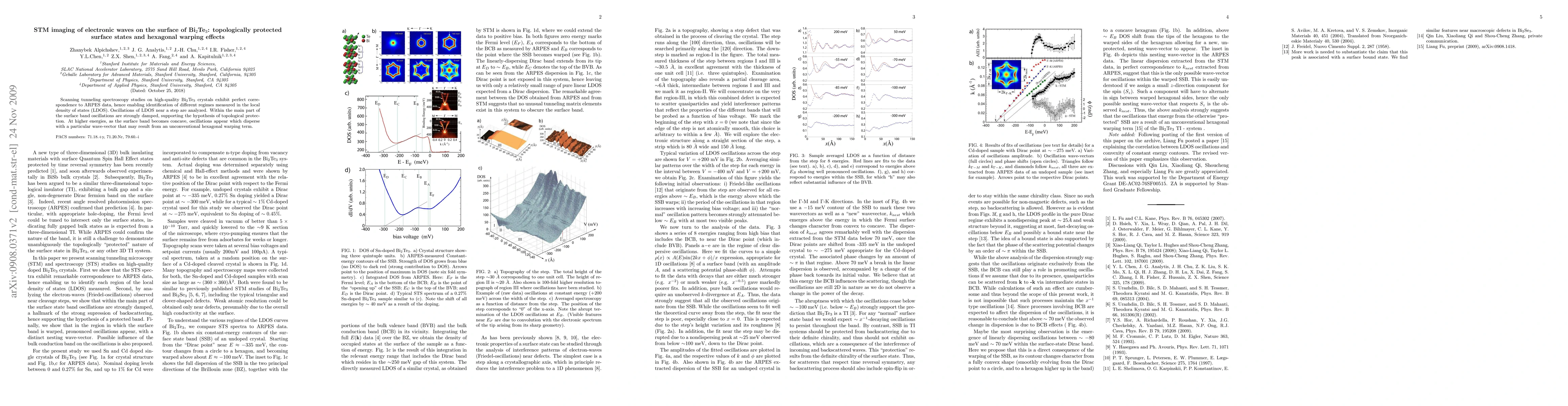 This paper uses scanning tunneling spectroscopy to study Bi$_2$Te$_3$ crystals, revealing topologically protected surface states and identifying hexagonal warping effects through oscillations in the local density of states. The findings support the topological protection hypothesis and suggest unconventional warping at higher energies.