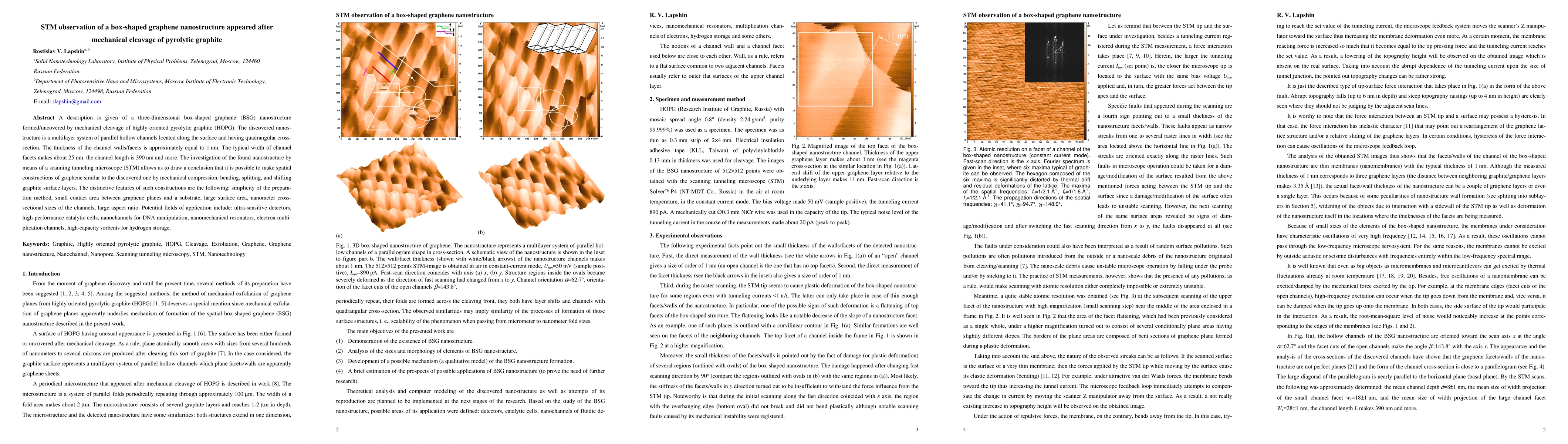 This paper reports the discovery of a box-shaped graphene nanostructure (BSG) formed via mechanical cleavage of highly oriented pyrolytic graphite, characterized by a multilayer system of parallel hollow channels. The study suggests potential applications in various fields including sensitive detectors and hydrogen storage due to its unique structural features.