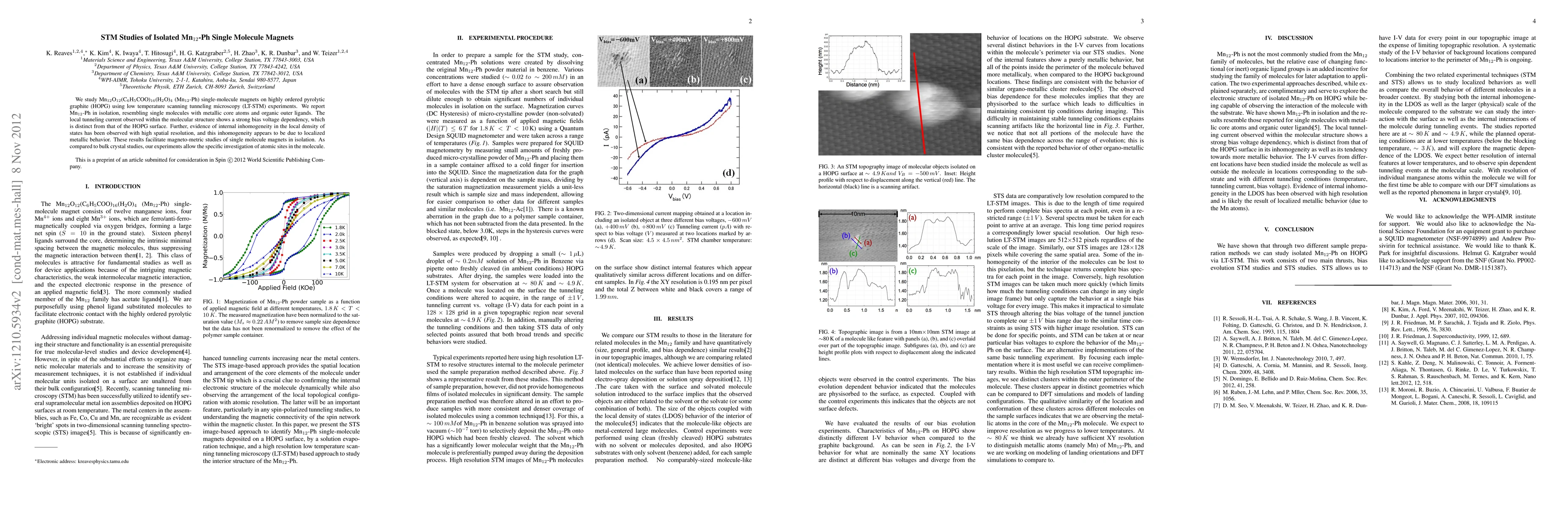 This paper reports on low temperature scanning tunneling microscopy (LT-STM) studies of isolated Mn12-Ph single molecule magnets on HOPG, revealing distinct metallic core behavior and internal inhomogeneity in the local density of states, thus enabling detailed magneto-metric studies of atomic sites in single molecules.