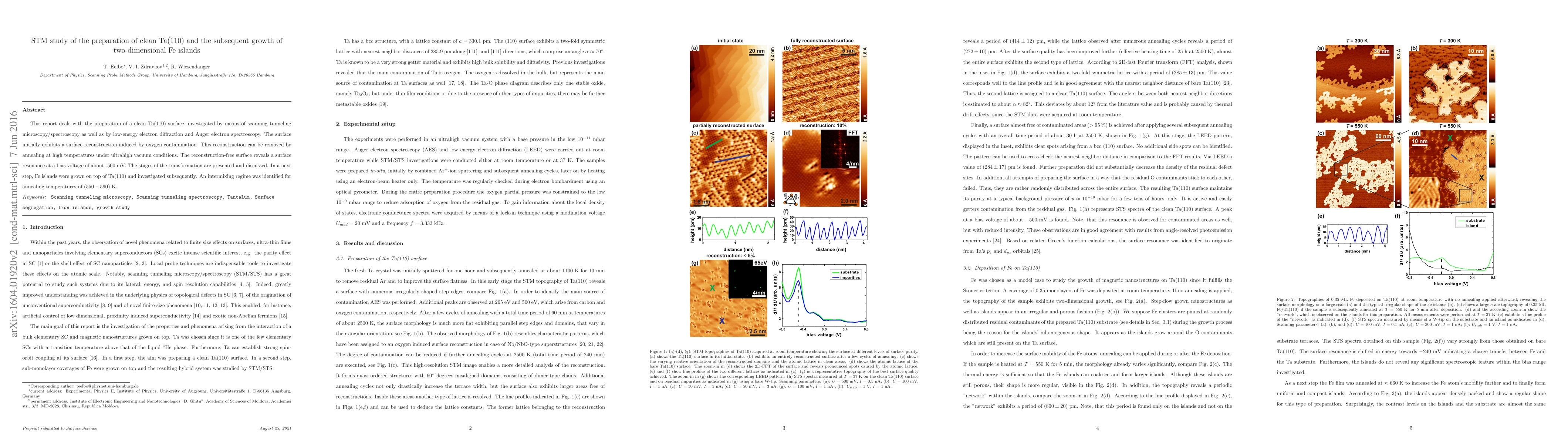 This report deals with the preparation of a clean Ta(110) surface, investigated by means of scanning tunneling microscopy/spectroscopy as well as by low-energy electron diffraction and Auger electron spectroscopy. The surface initially exhibits a surface reconstruction induced by oxygen contamination. This reconstruction can be removed by annealing at high temperatures under ultrahigh vacuum conditions. The reconstruction-free surface reveals a surface resonance at a bias voltage of about -500 mV. The stages of the transformation are presented and discussed. In a next step, Fe islands were grown on top of Ta(110) and investigated subsequently. An intermixing regime was identified for annealing temperatures of (550 - 590) K.