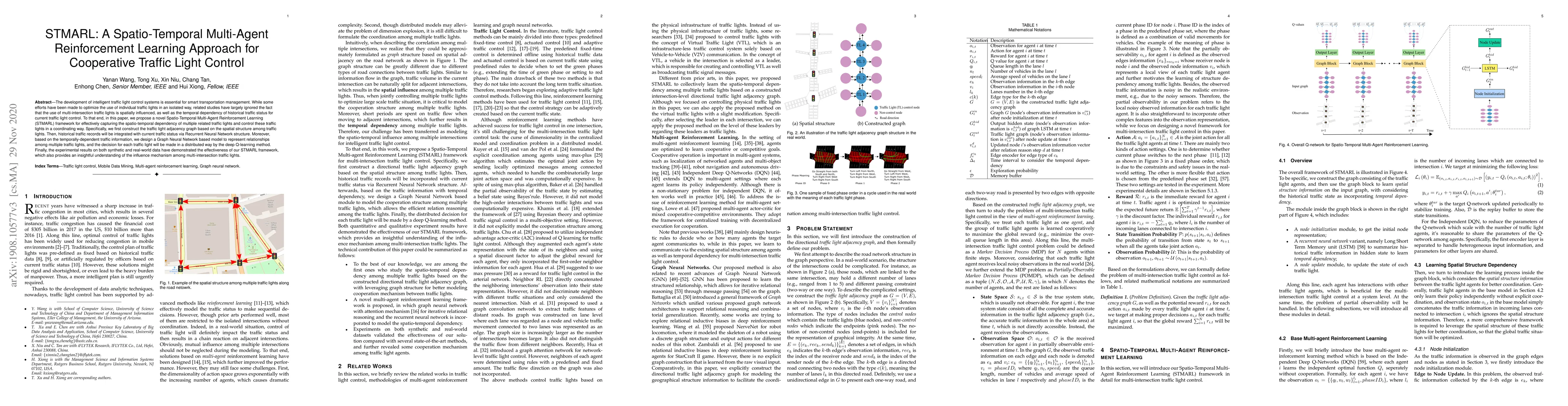 This paper proposes STMARL, a SpatioTemporal Multi-Agent Reinforcement Learning framework for optimizing cooperative traffic light control. It integrates spatial dependencies via a traffic light adjacency graph and temporal dependencies through a Recurrent Neural Network, using Graph Neural Networks and distributed deep Q-learning for traffic light coordination. Experimental results show its effectiveness in both synthetic and real-world scenarios.