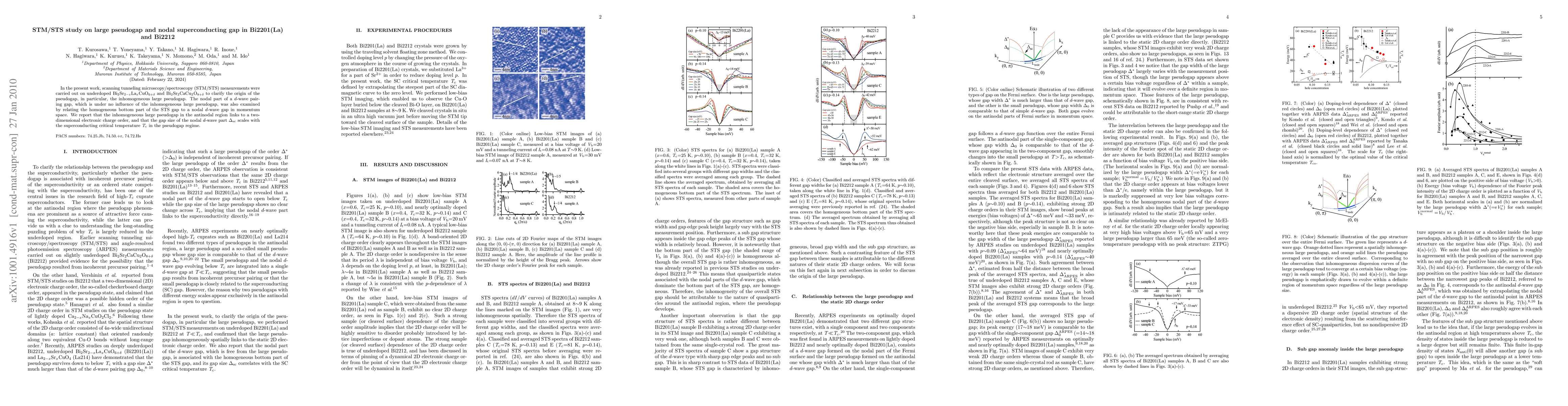 The study uses STM/STS on underdoped Bi2201(La) and Bi2212 to investigate the pseudogap and superconducting gap. It finds that the inhomogeneous large pseudogap in the antinodal region correlates with a 2D electronic charge order, while the nodal d-wave part of the superconducting gap scales with critical temperature Tc in the pseudogap regime.