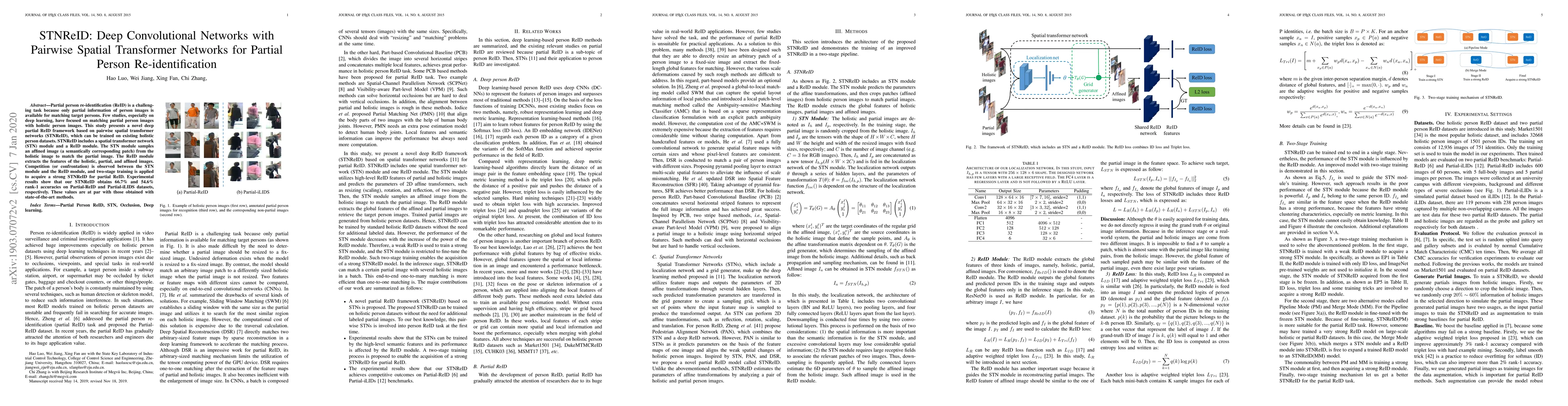 STNReID employs deep convolutional networks with pairwise spatial transformer networks to tackle the challenge of partial person re-identification, achieving competitive rank-1 accuracies of 66.7% and 54.6% on two datasets, demonstrating its effectiveness in matching partial to holistic person images.