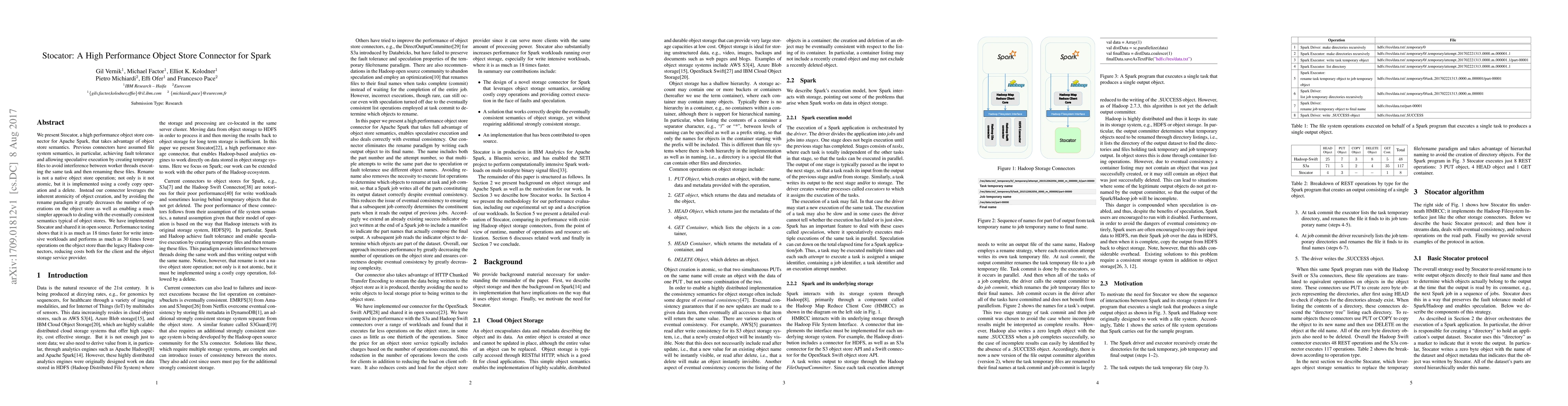 We present Stocator, a high performance object store connector for Apache Spark, that takes advantage of object store semantics. Previous connectors have assumed file system semantics, in particular, achieving fault tolerance and allowing speculative execution by creating temporary files to avoid interference between worker threads executing the same task and then renaming these files. Rename is not a native object store operation; not only is it not atomic, but it is implemented using a costly copy operation and a delete. Instead our connector leverages the inherent atomicity of object creation, and by avoiding the rename paradigm it greatly decreases the number of operations on the object store as well as enabling a much simpler approach to dealing with the eventually consistent semantics typical of object stores. We have implemented Stocator and shared it in open source. Performance testing shows that it is as much as 18 times faster for write intensive workloads and performs as much as 30 times fewer operations on the object store than the legacy Hadoop connectors, reducing costs both for the client and the object storage service provider.