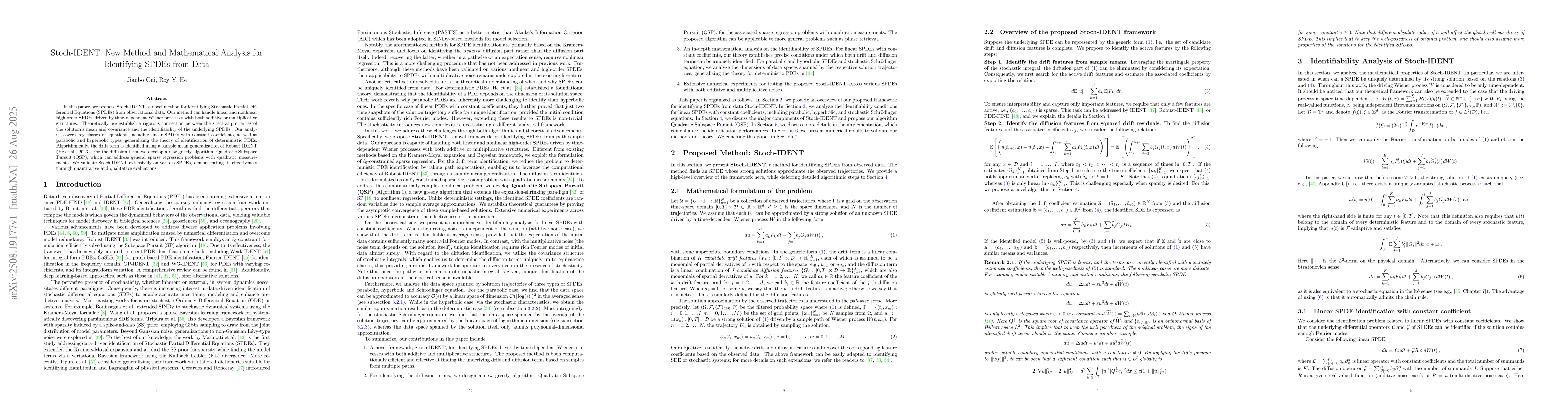In this paper, we propose Stoch-IDENT, a novel method for identifying Stochastic Partial Differential Equations (SPDEs) from observational data. Our method can handle linear and nonlinear high-order SPDEs driven by time-dependent Wiener processes with both additive or multiplicative structures. Theoretically, we establish a rigorous connection between the spectral properties of the solution's mean and covariance and the identifiability of the underlying SPDEs. Our analysis covers key classes of equations, including linear SPDEs with constant coefficients, as well as parabolic and hyperbolic types, generalizing the theory of identification of deterministic PDEs. Algorithmically, the drift term is identified using a sample mean generalization of Robust-IDENT (He et al., 2023). For the diffusion term, we develop a new greedy algorithm, Quadratic Subspace Pursuit (QSP), which can address general sparse regression problems with quadratic measurements. We validate Stoch-IDENT extensively on various SPDEs, demonstrating its effectiveness through quantitative and qualitative evaluations.