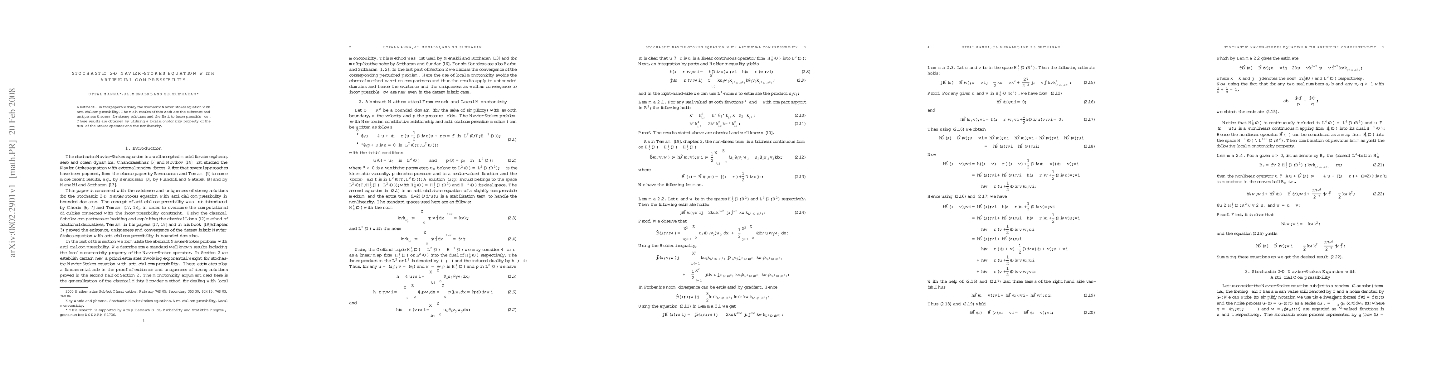 The paper investigates the stochastic 2-D Navier-Stokes equation with artificial compressibility, proving the existence and uniqueness of strong solutions and demonstrating convergence to incompressible flow, utilizing the local monotonicity property of the combined Stokes operator and nonlinearity.